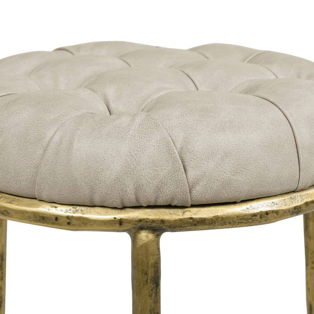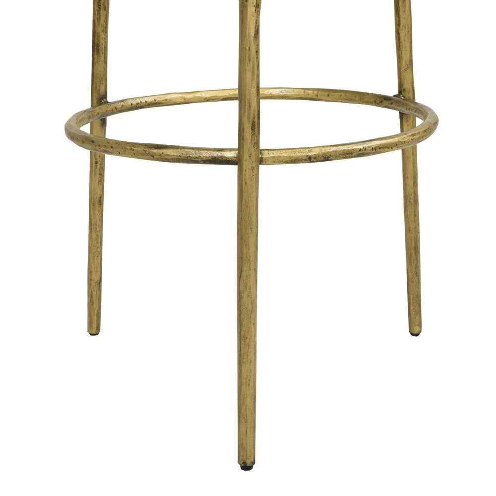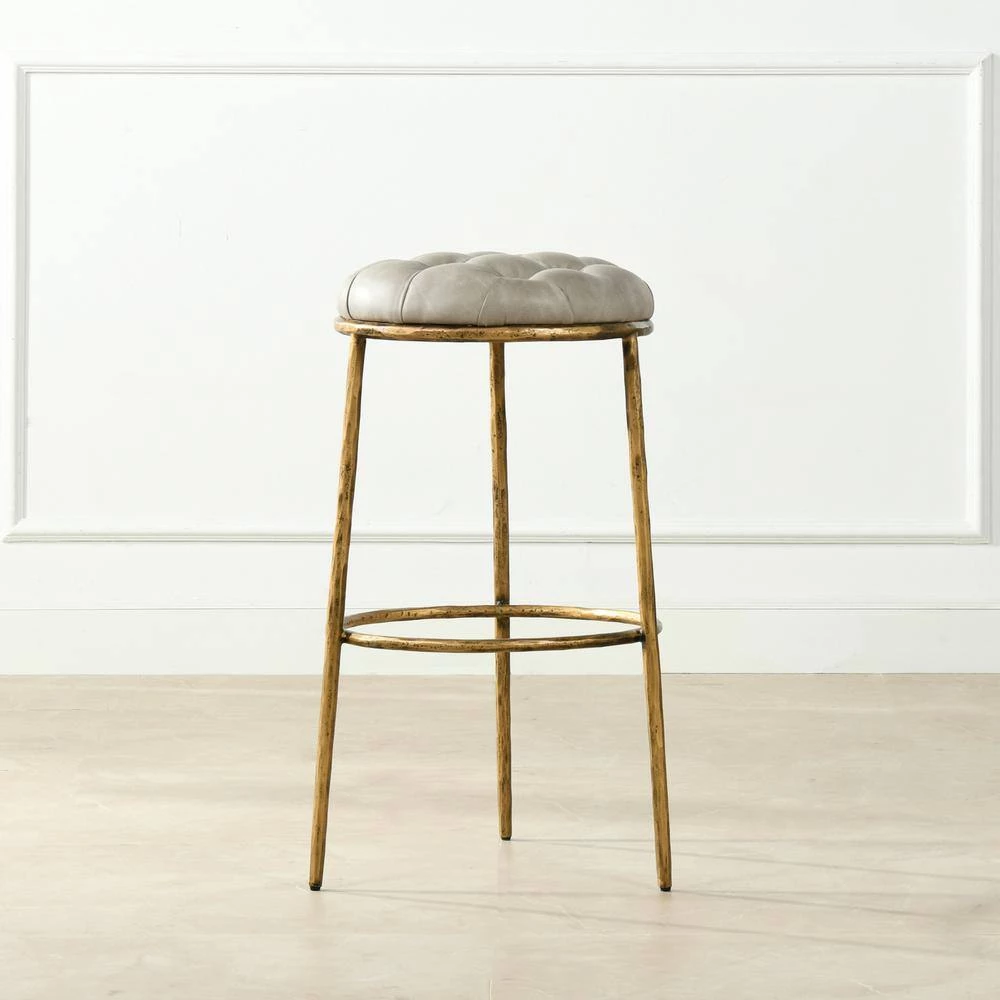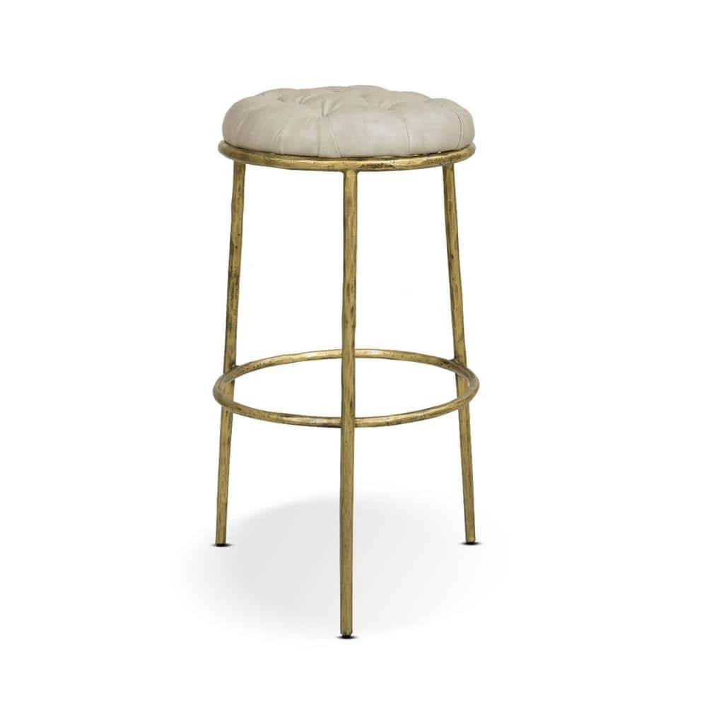 The Aerin Collection by Jennifer Taylor Home is defined by hammered brass metal in beautifully delicate silhouettes. This 3 legged bar stool features a round, backless silhouette with plush, button tufting on the seat. The footrest is the perfect height for, relaxing your feet while seating. Available in bar and counter heights.
