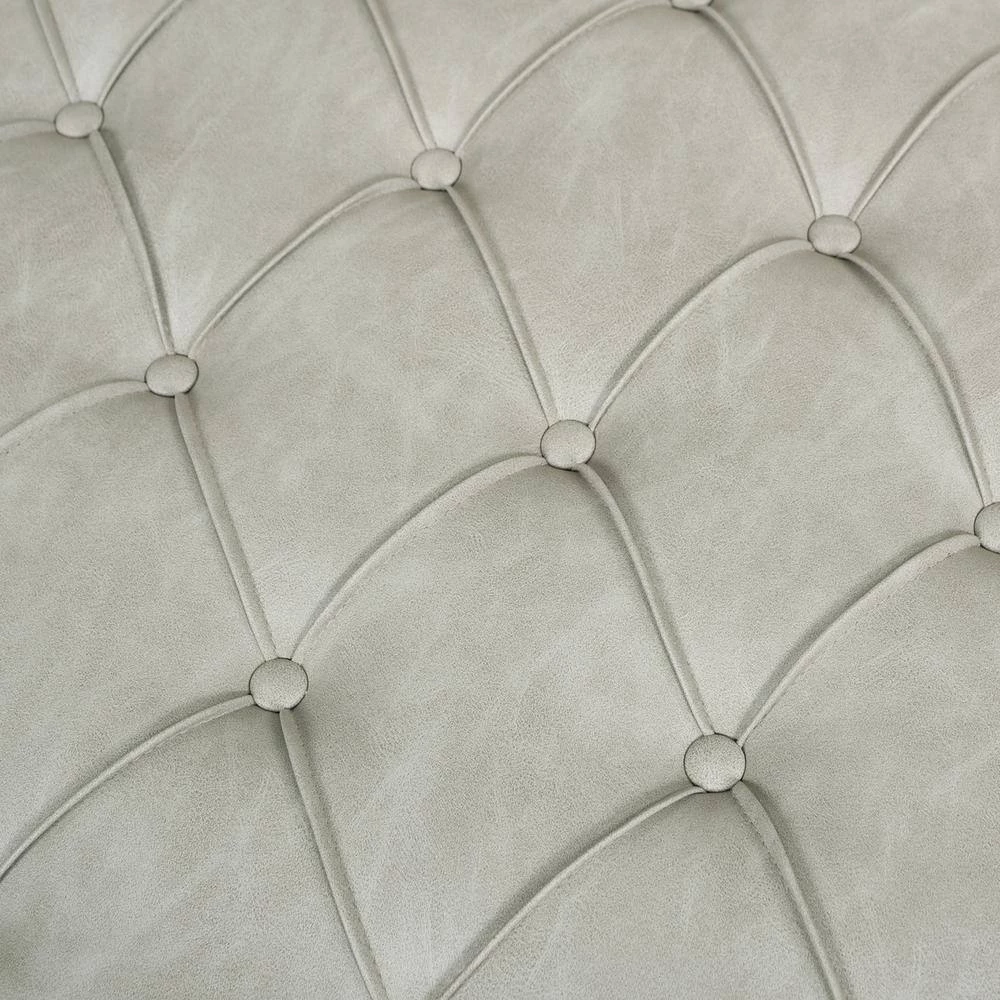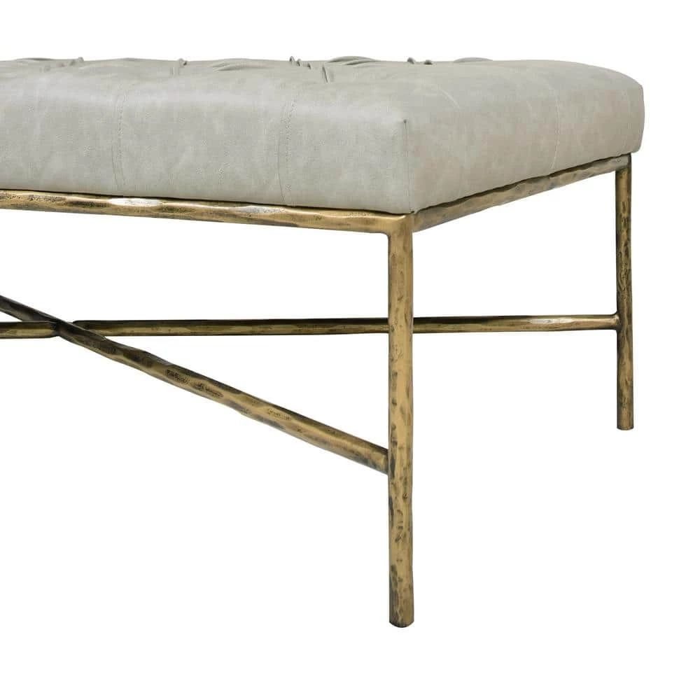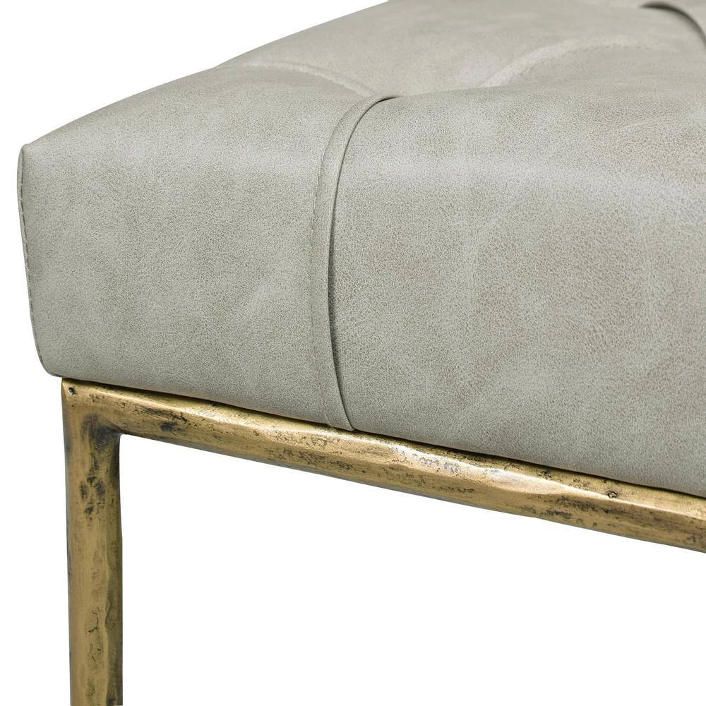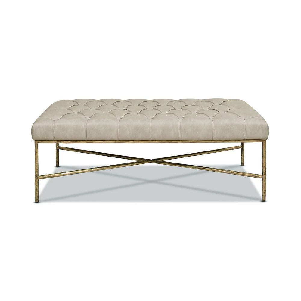 The Aerin Collection by Jennifer Taylor Home is defined by hammered brass metal in beautifully delicate silhouettes. This beautifully framed cocktail ottoman is generously sized to fit perfectly in front of a sofa or sectional. Upholstered in a contemporary gray faux leather, the top can display decor items on a tray or be a footrest while seated. Use this ottoman as a bench in a walk in closet or entryway for added versatility.