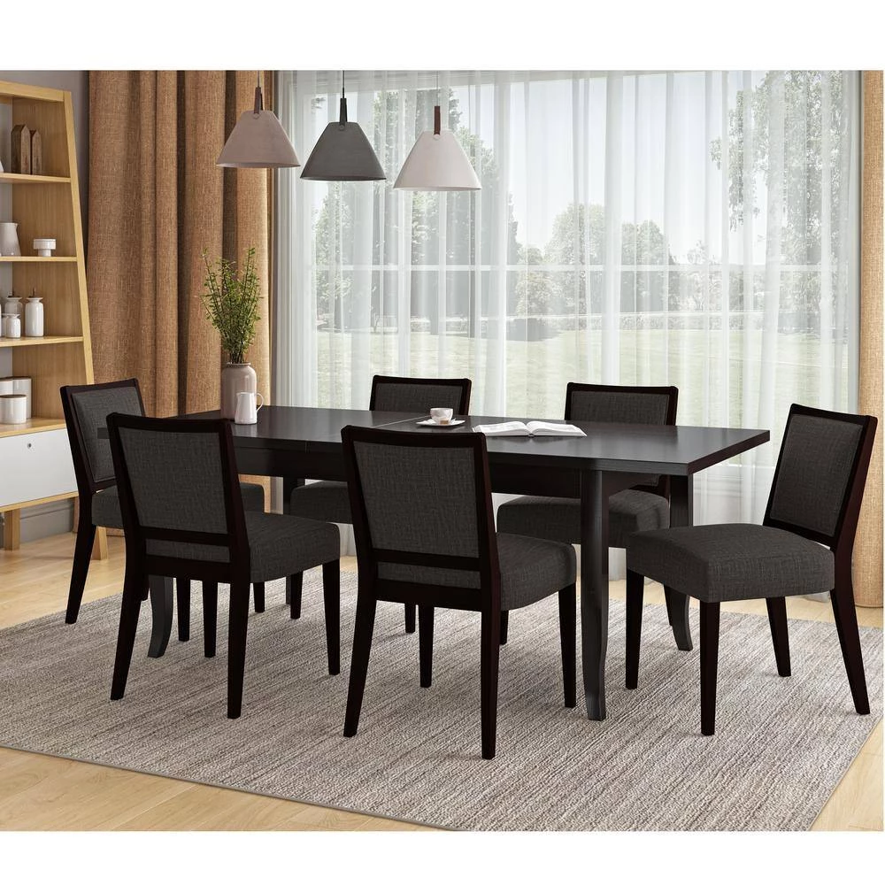 This 7-piece dining set includes 6 armless side chairs and an expandable rectangular dining table that boast an updated classic design that will elevate the look of your home. The chairs feature a solid wood frame and legs in an espresso brown finish with an upholstered seat and back cushion that provides the perfect amount of support for extraordinary comfort. The table features a rubber wood table top and four squared legs with a graceful curve near the bottom in an espresso brown finish that provides the perfect amount of style and support. This versatile table has a self-storing 15.75″ wide butterfly leaf allowing you to easily expand the table from 65″ to 80.75″ for larger family gatherings or entertaining. Takes less than 60 minutes to assemble with included instructions and tool for assembly. Imported, color may vary.