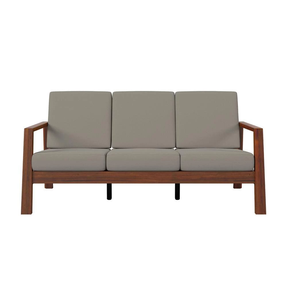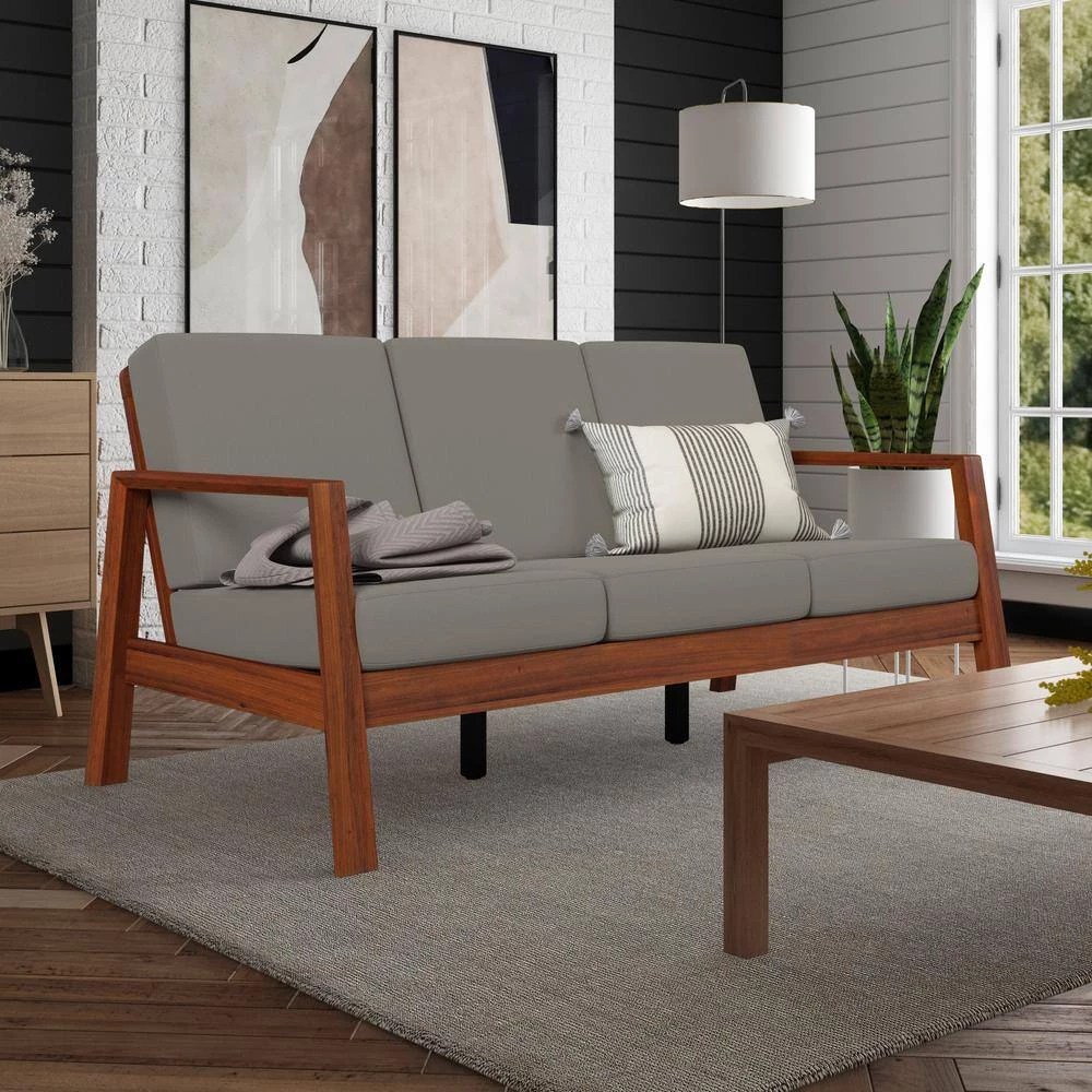 Inspired by the clean lines of mid-century modern design, our sofa features an exposed wood frame with a slatted back in a rich cherry finish. The comfortable box-seat cushions are covered in a durable, easy clean 100% polyester fabric. Ships in one (1) box. Takes less than 30 minutes to assemble with included tool, instructions and a Phillips screwdriver (not included). Imported, color may vary.