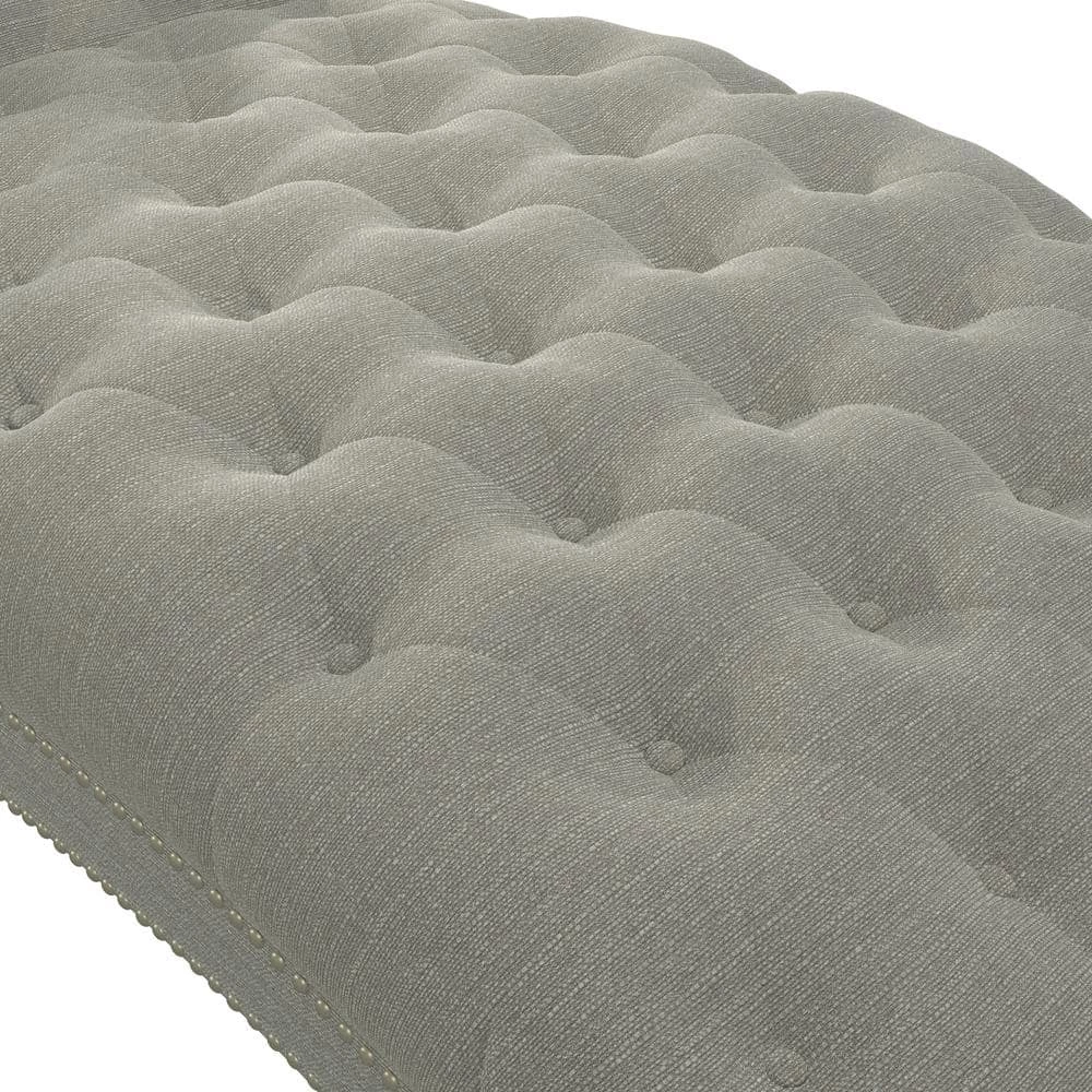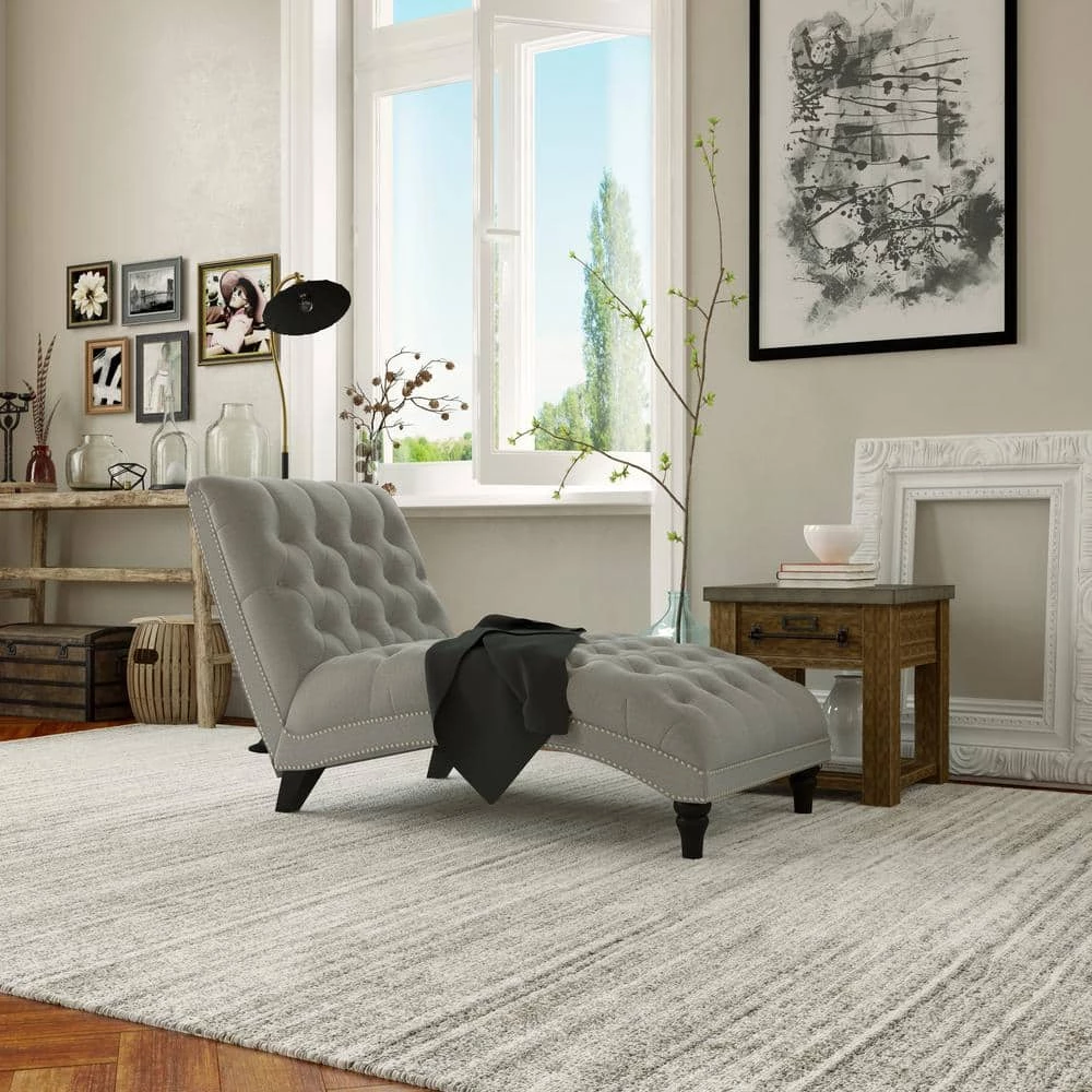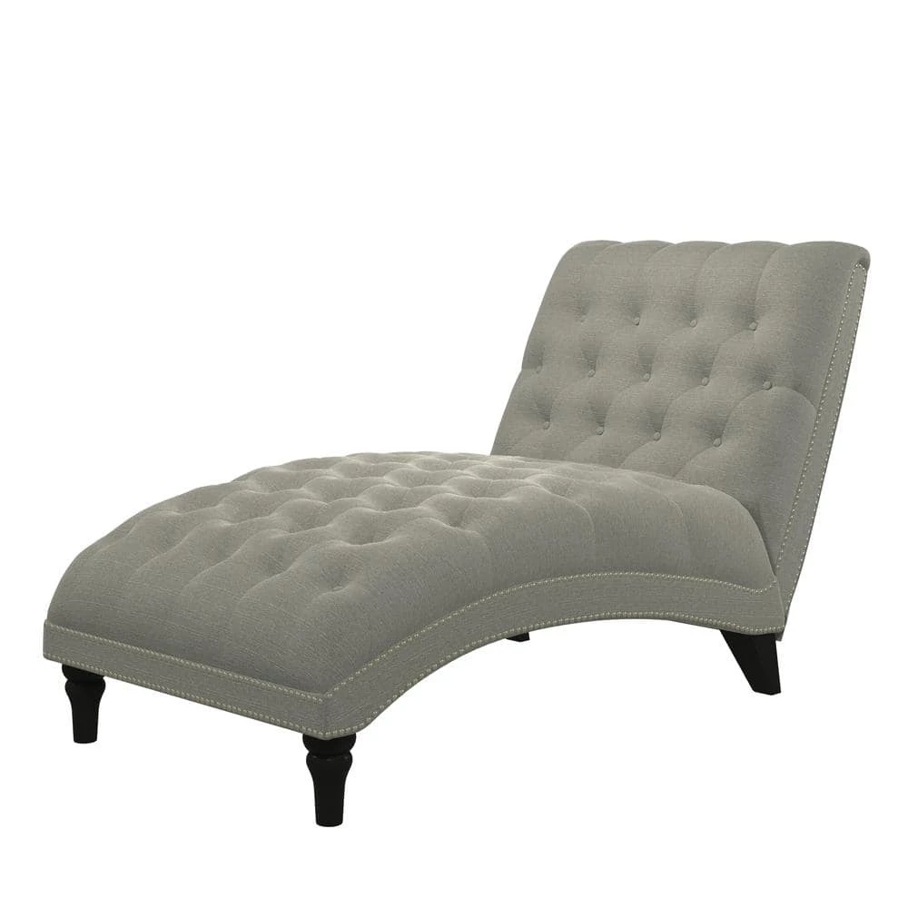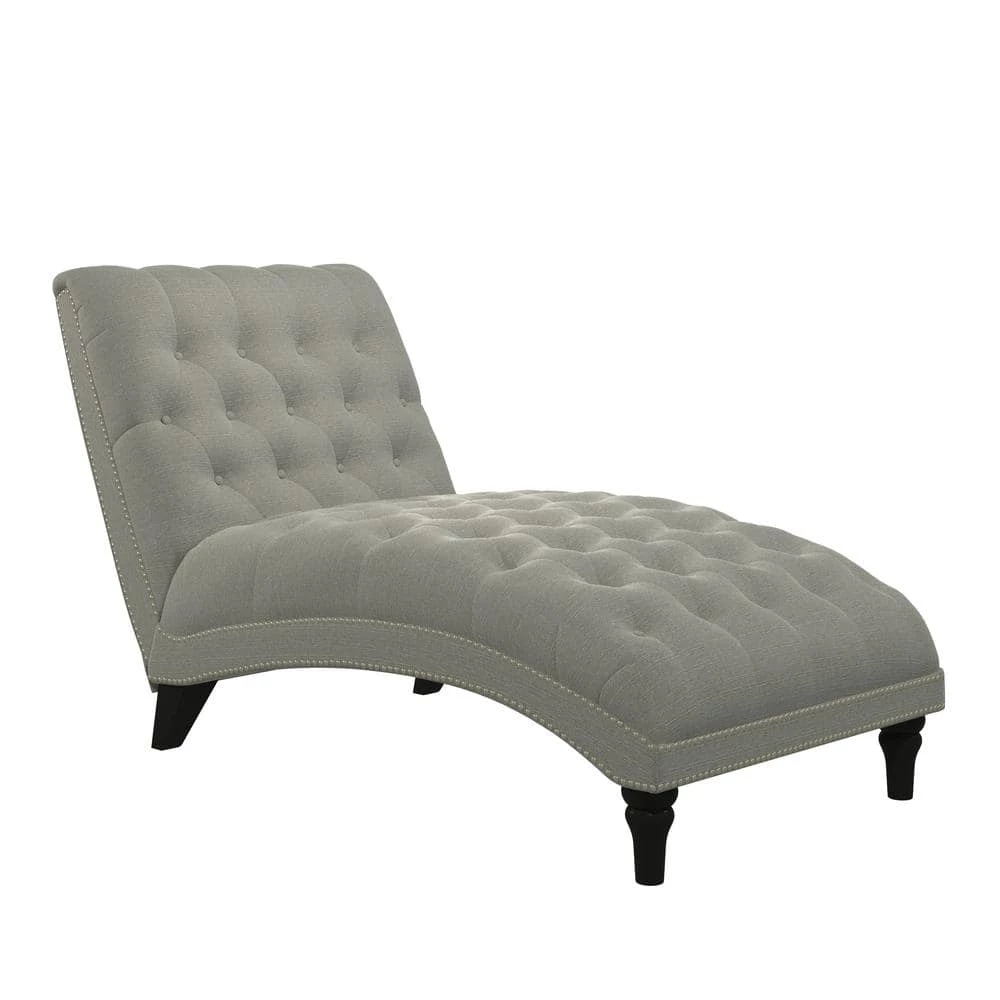 Upholstered chaise lounge features an inviting and elegant design with clean lines, a curved seat and arched back. It is accented with lace tufting on the seat and the back and is complimented with hand applied pewter nail head trim. The wider seating surface allows for snuggling up with your favorite person, pet or just enjoying the extra space for yourself to lounge, nap or relax in comfort. The fully upholstered chaise is filled with foam and fiber. Covered in a durable, easy clean 100% polyester linen-like fabric. Takes less than 45 minutes to assemble with included tool and instructions. Imported, color may vary.