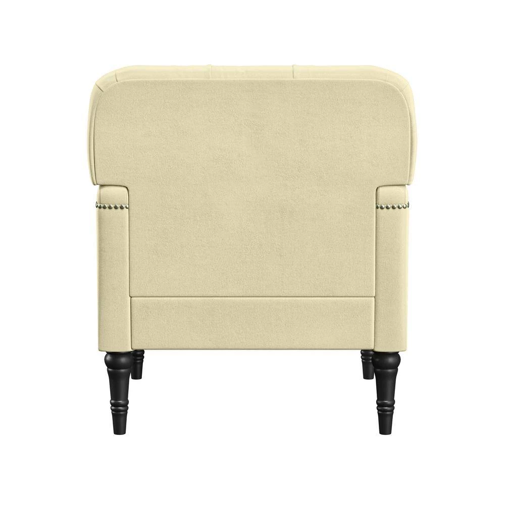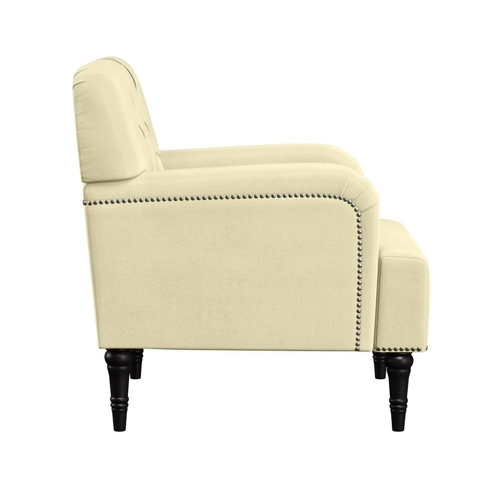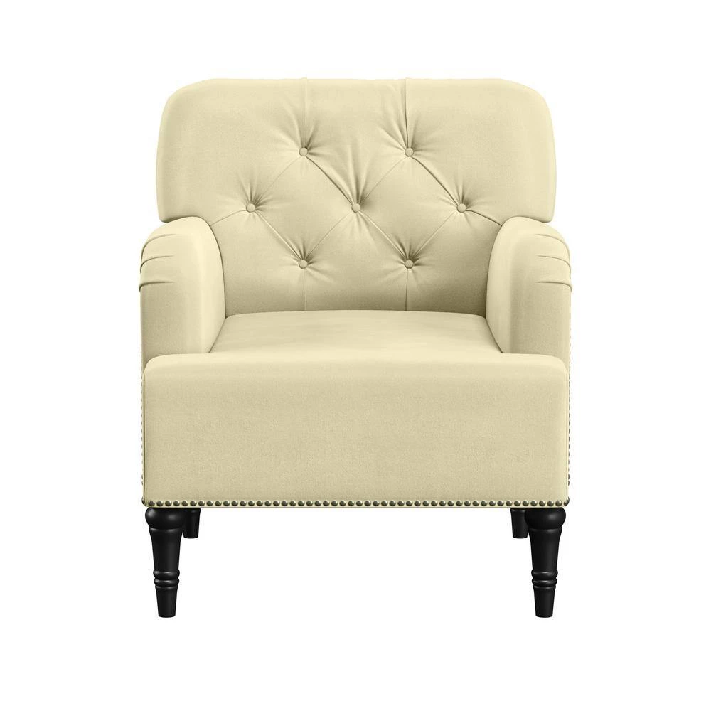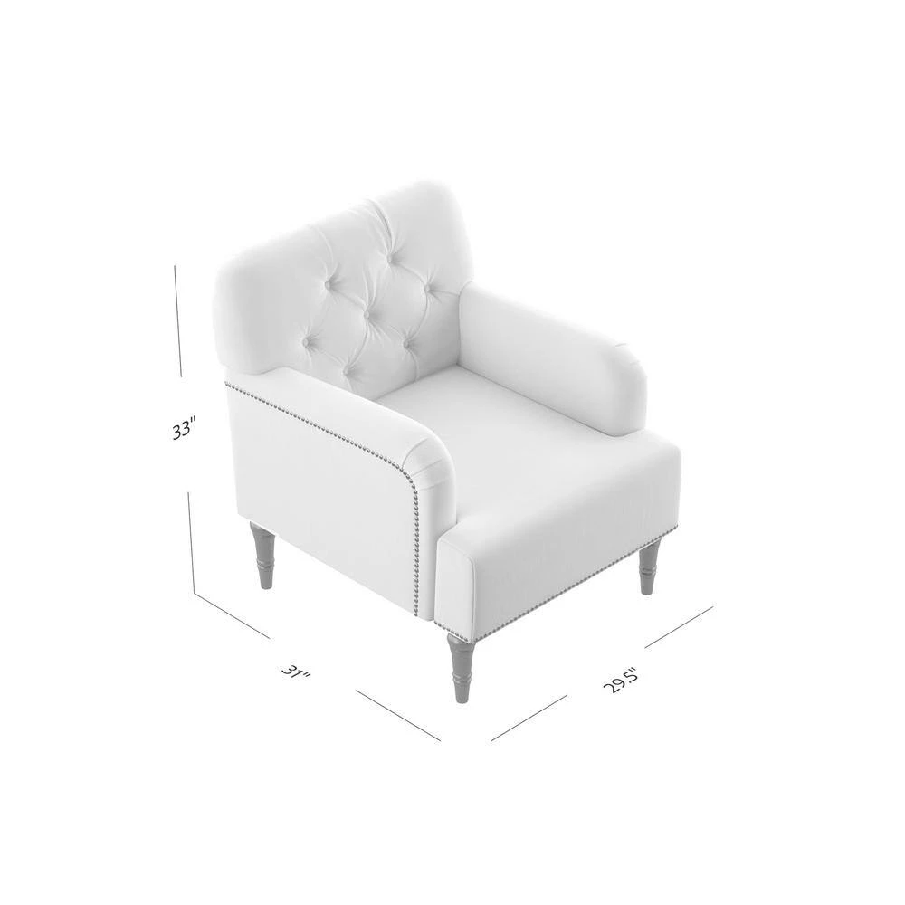 This diamond button-tufted armchair covered in a soft-to-the-touch velvet fabric made from 100% polyester has a timeless sensibility that will remain relevant over time and trends. Traditionally styled with a square back and saddle arms, the chair is detailed with hand-tacked pewter nail-head trim for a polished finish. Assembly required with included tool and instructions. Imported, color may vary.
