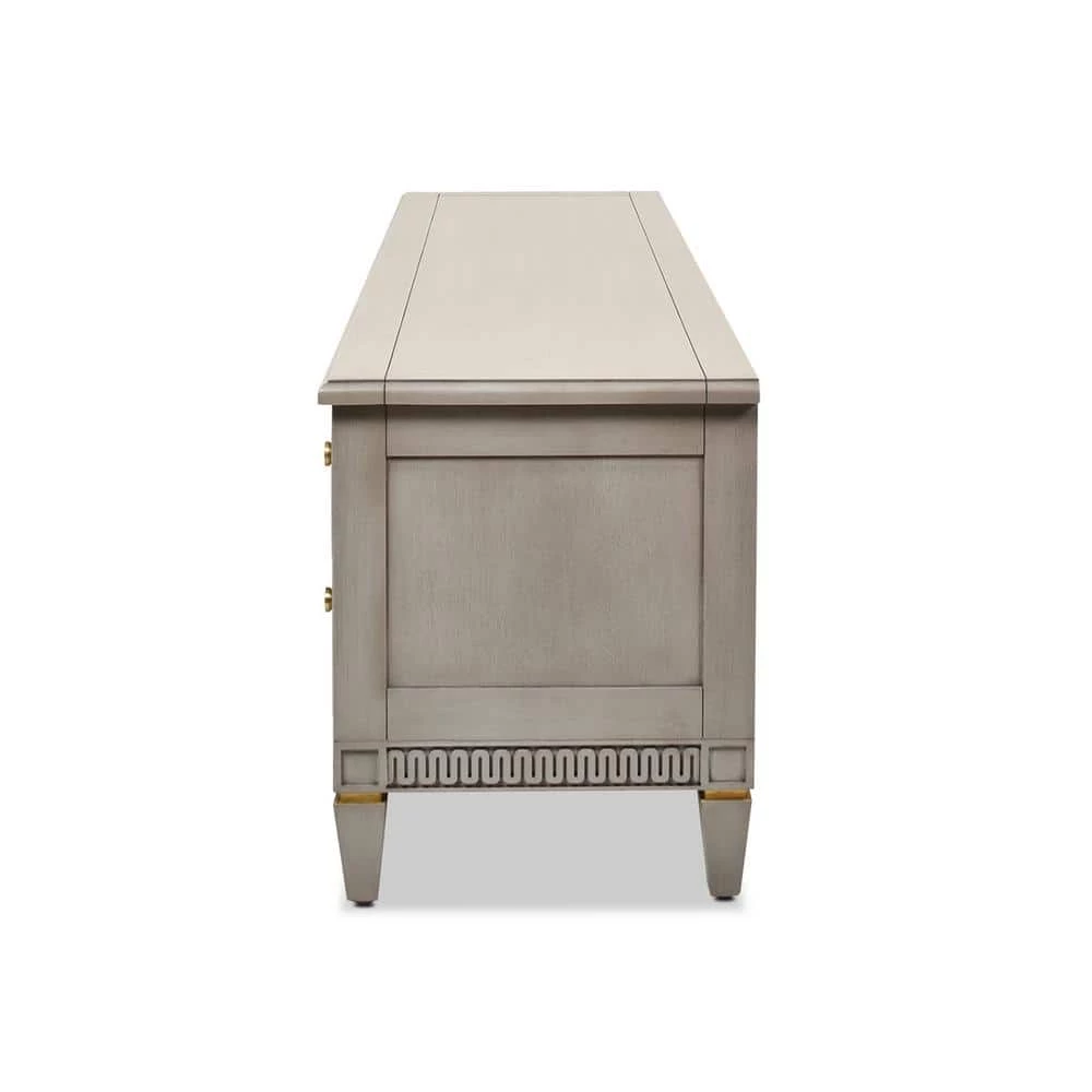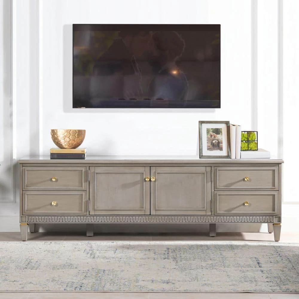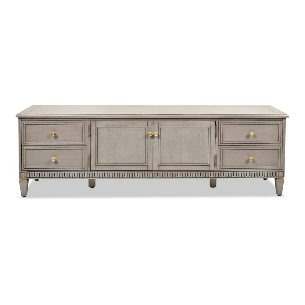 Elegant and understated, the Dauphin 71″ Entertainment Storage Console by JTH Luxe is a timeless classic casegood furnishing for today’s multi-functional living and entertainment space. The 71 inch length can easily display all of your collectors’ items and decor, or be the support for widescreen up to a recommended size of 65″. The beautiful veneer in a trendy Cashmere Grey is accented with satin gold hardware and hand-painted gold accents. This TV unit also features ample storage compartments for all your electronic devices with one wide shelving area and drawers on either side. The best part: assembly is not required – this unit arrives fully assembled. See the Dauphin Collection for the matching side and coffee tables, dining table and chairs, and more.