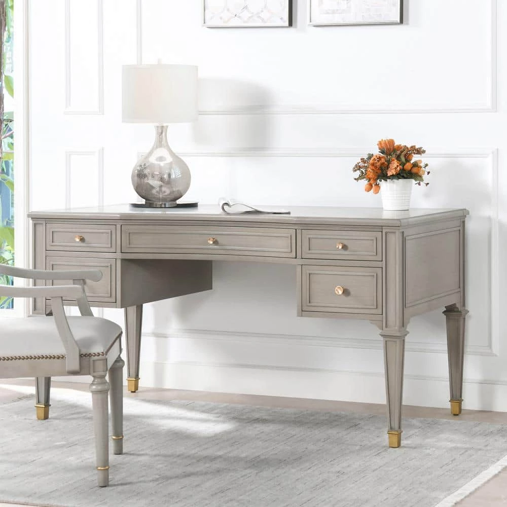 Create an elegant home office with the Dauphin Wood Desk by JTH Luxe as the centerpiece. A truly designer furnishing from every angle, this desk is crafted from solid birch wood and stained a classic gray, allowing the beautiful wood grain to peek through. Satin gold knobs are complemented by the hand-painted detail on the tapered legs and temper the overall piece with a modern touch that is as functional as it is stylish. Envision the rest of your space with the Dauphin Collection by JTH Luxe for a cohesive style vignette throughout your home.