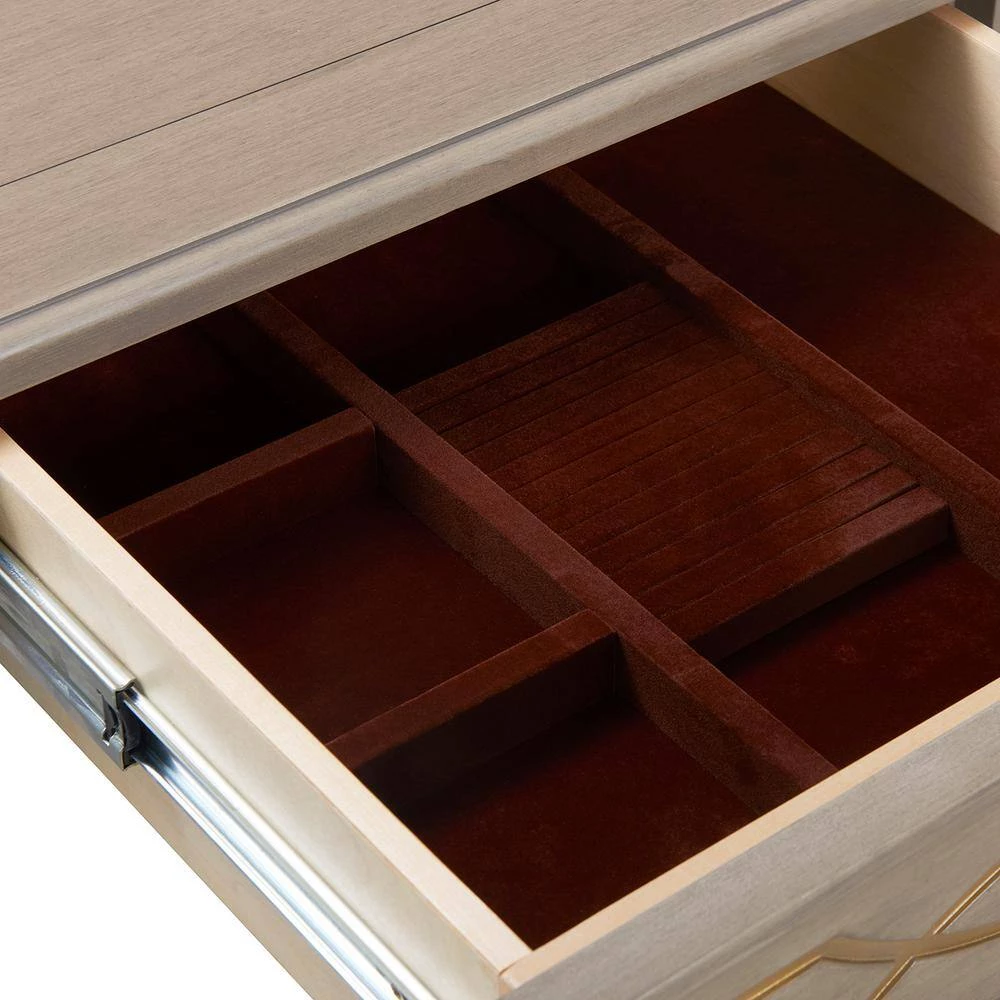 - Drawer pulls are in a satin-gold tone finish