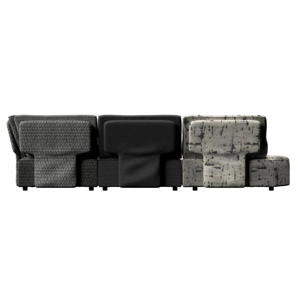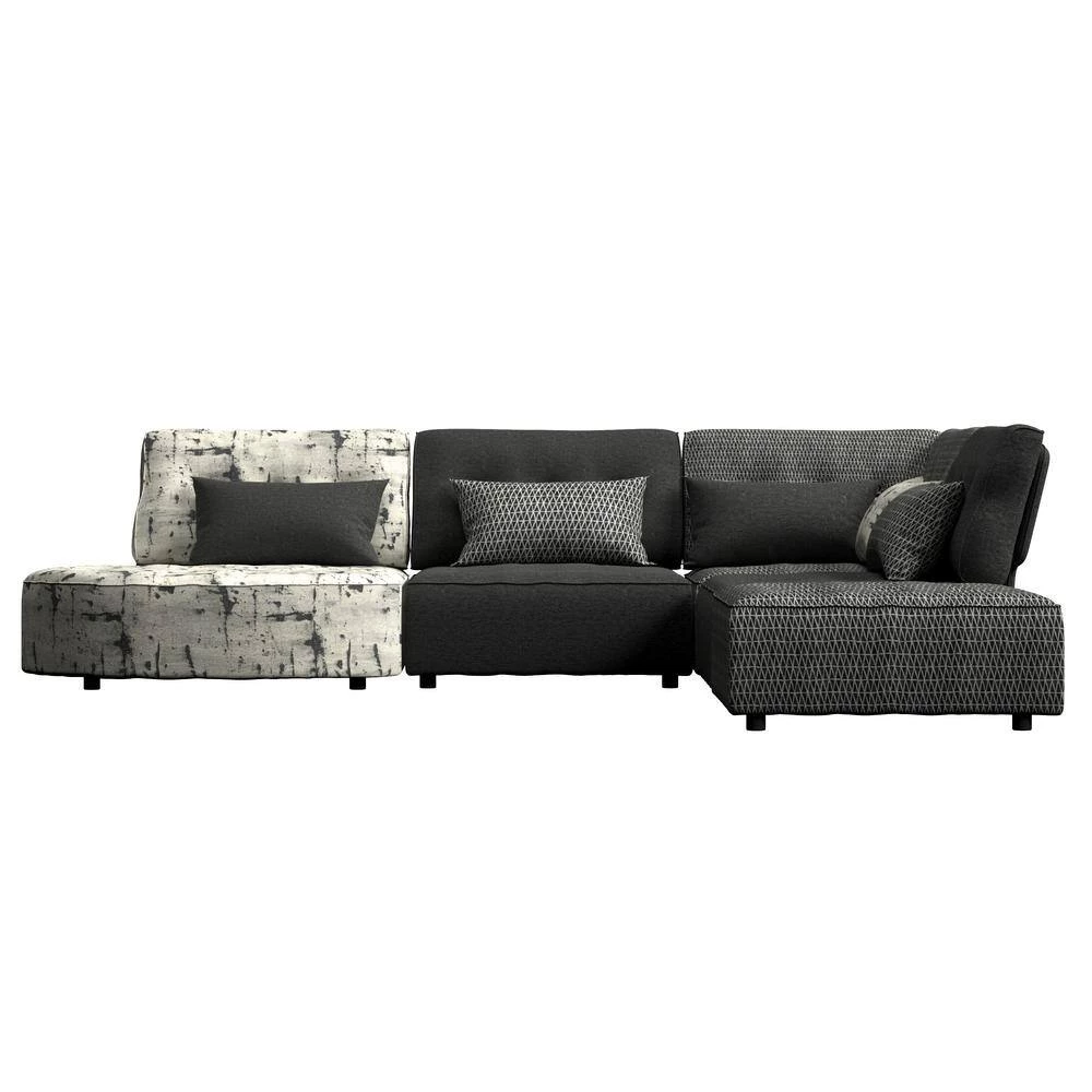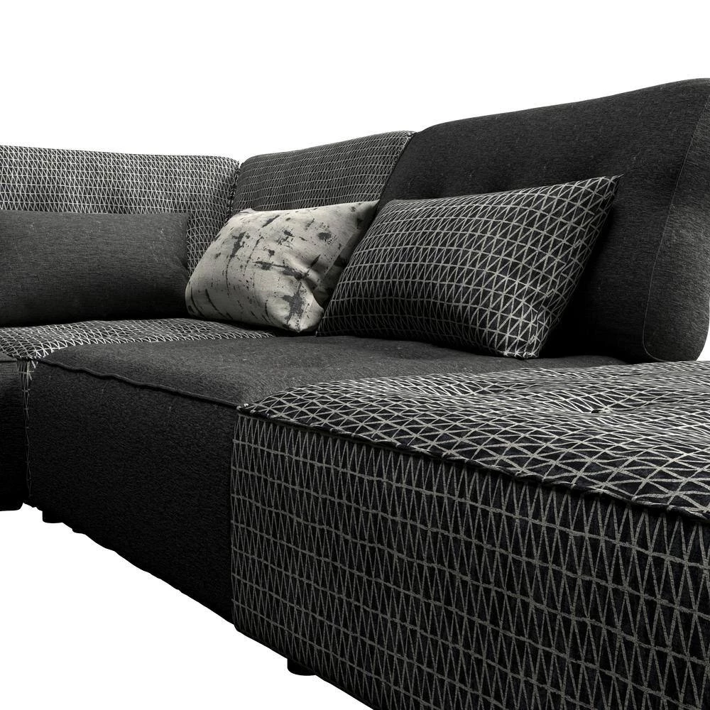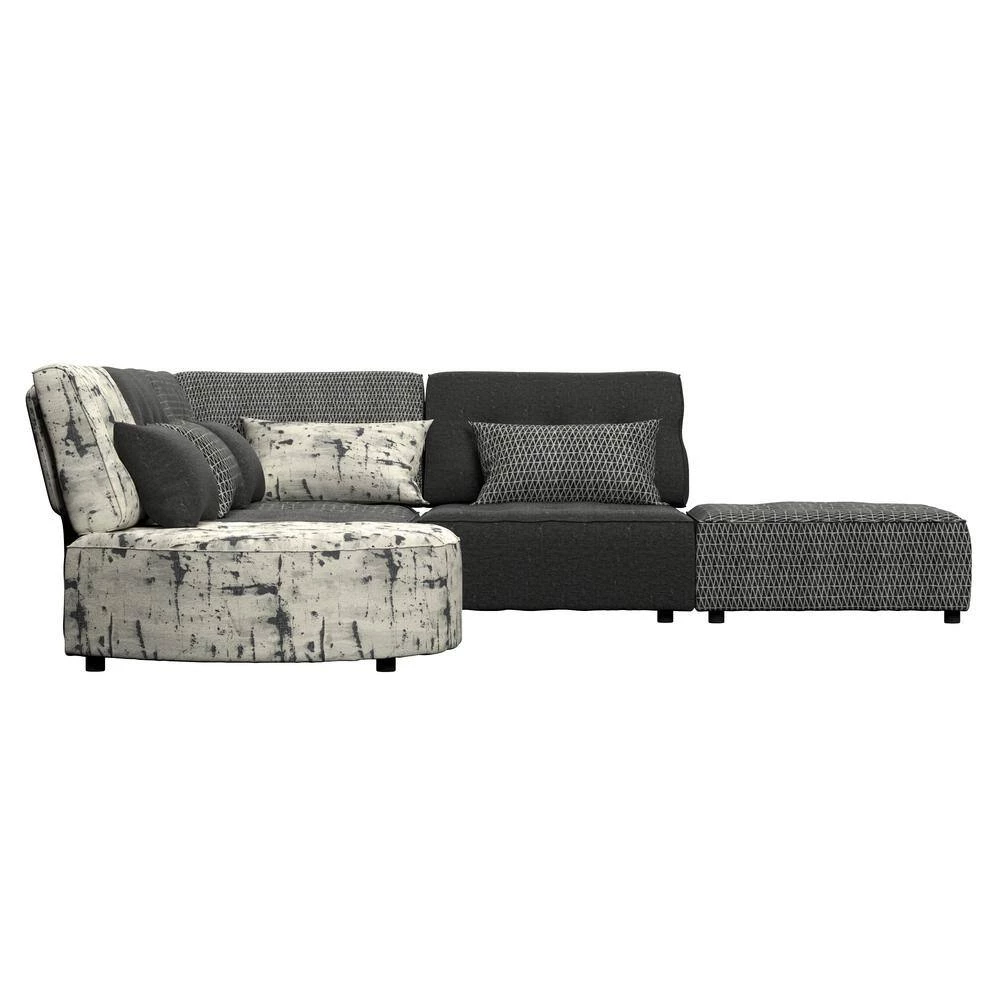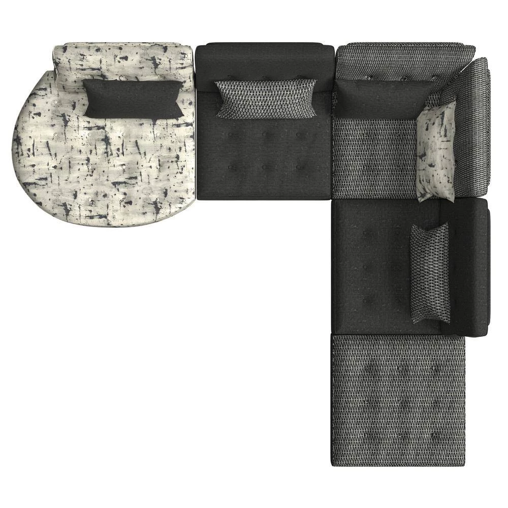 This modern modular 5-piece sectional sofa has a unique designer look and boasts a combination of straight and curved lines to provide a custom look for your home. The sectional features a corner chair, 2 armless chairs, an ottoman that can be added to the end to create a chaise, plus a rounded armless end chair for a dramatic look. In addition, the sectional has tight seat cushions with button tufted detailing for comfort and style. The versatile modular pieces allow you the flexibility to configure your sectional while the clip connection on the legs will keep the pieces securely attached. Includes 5 accent pillows.