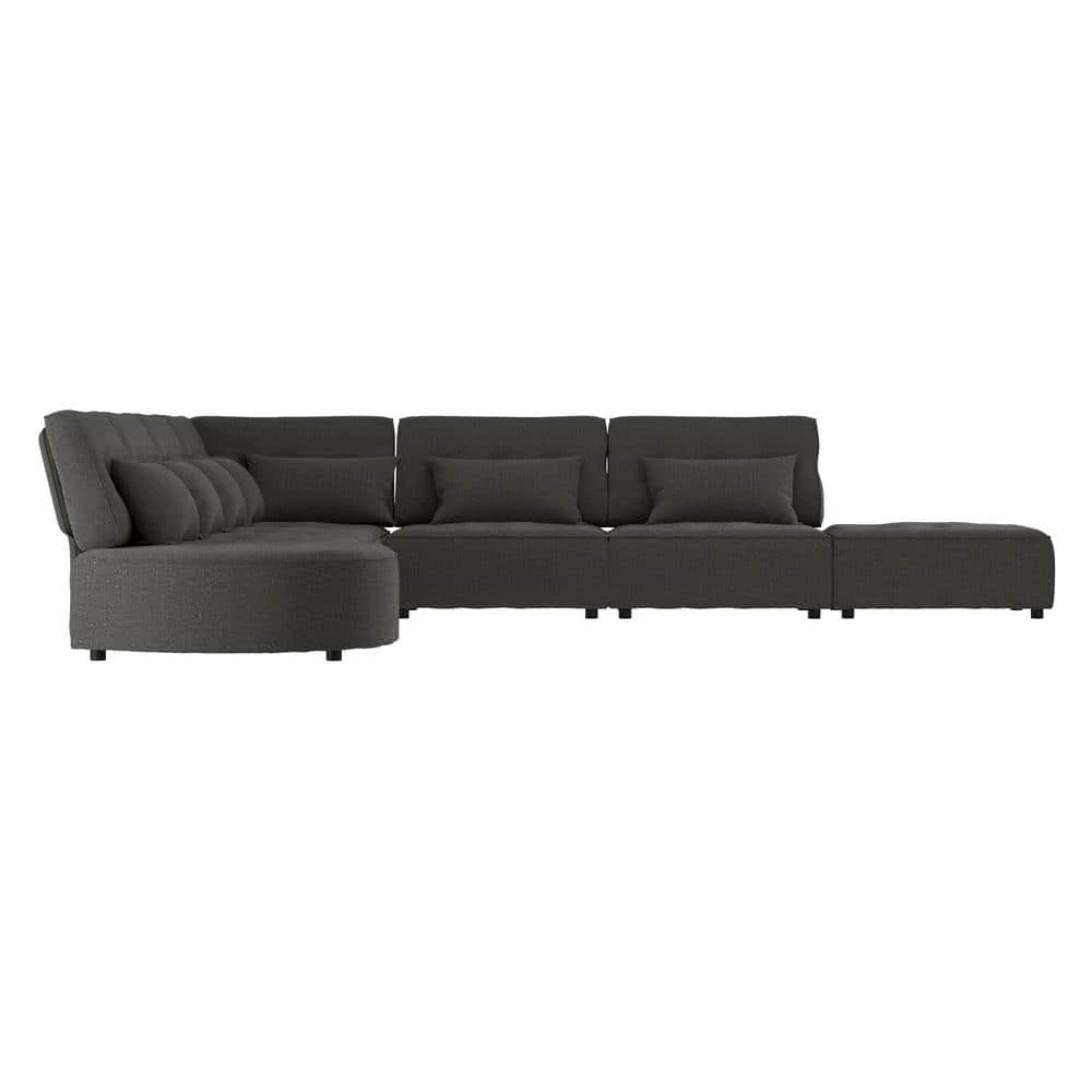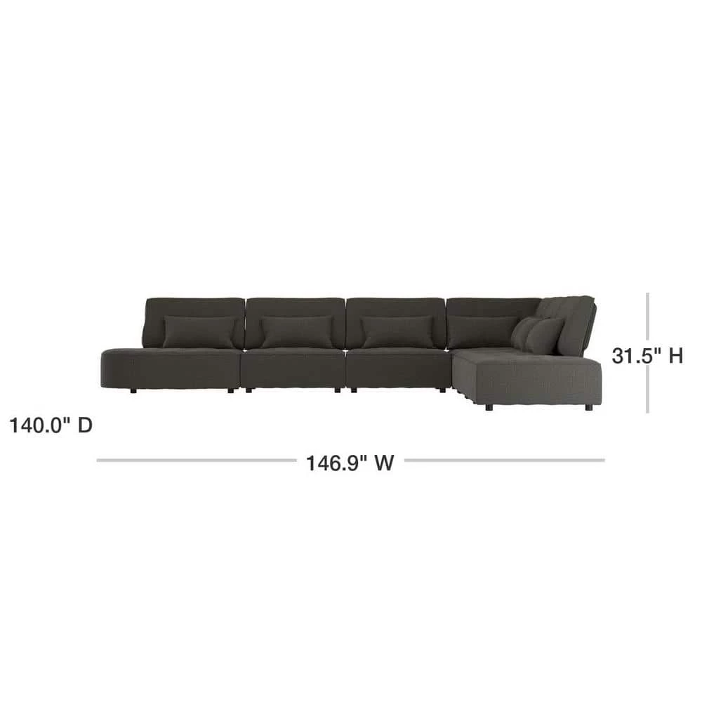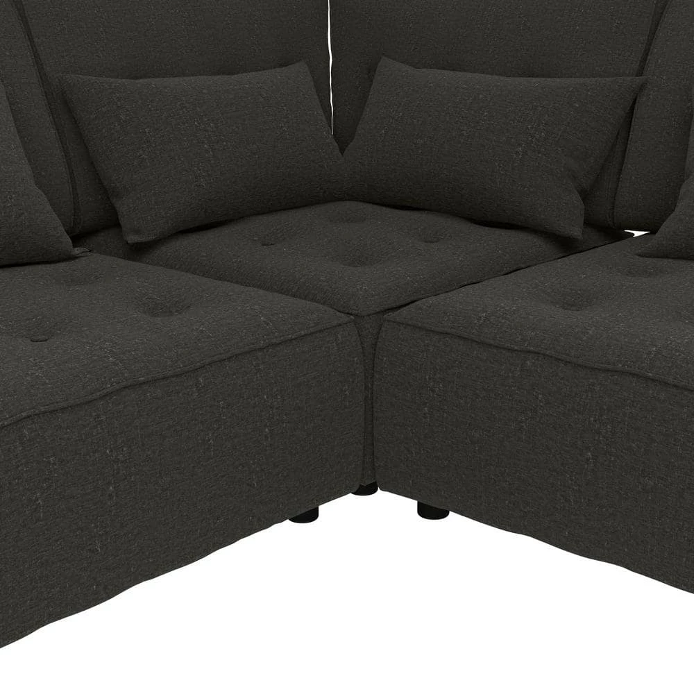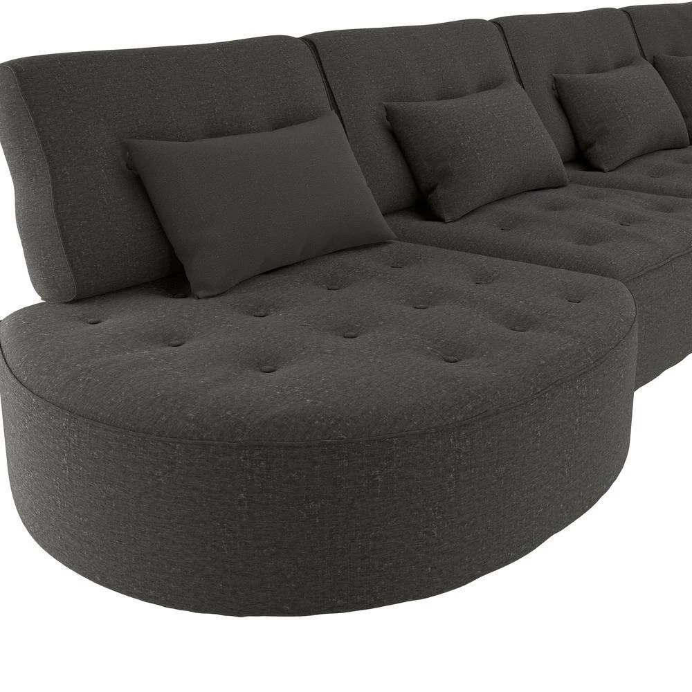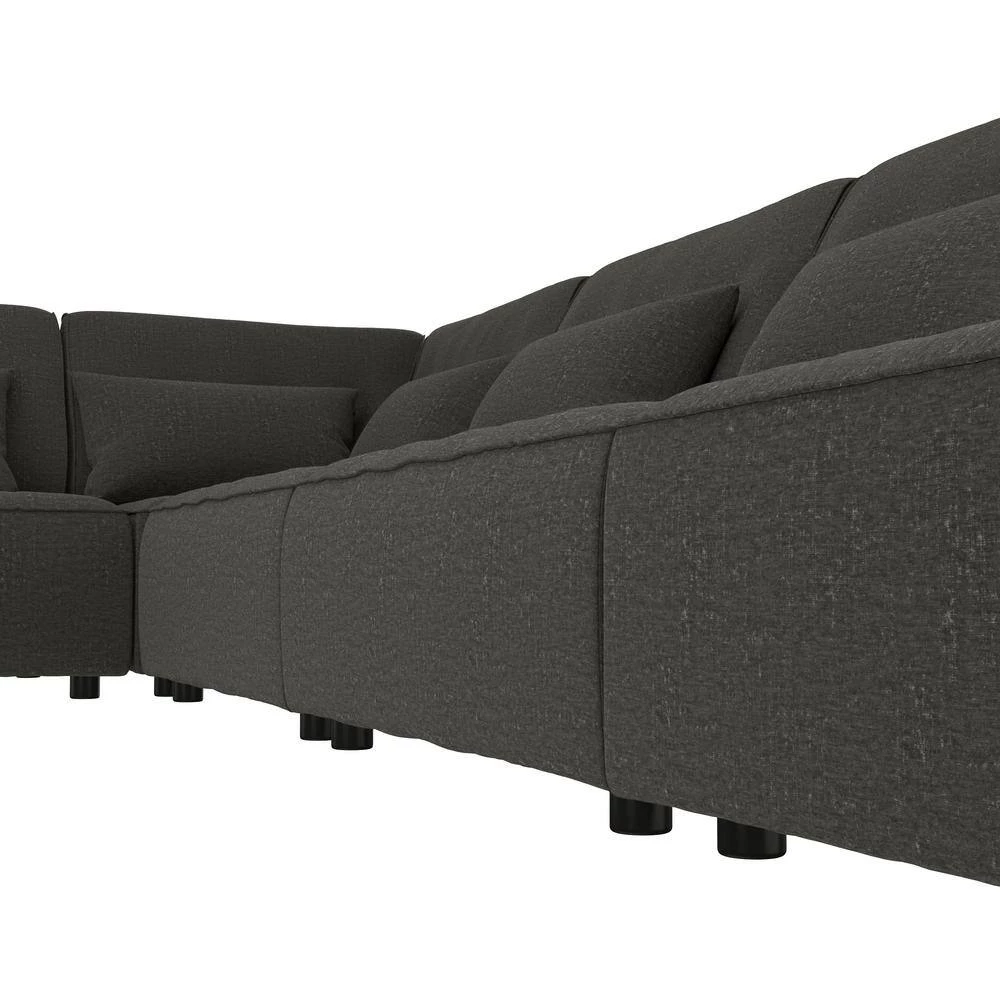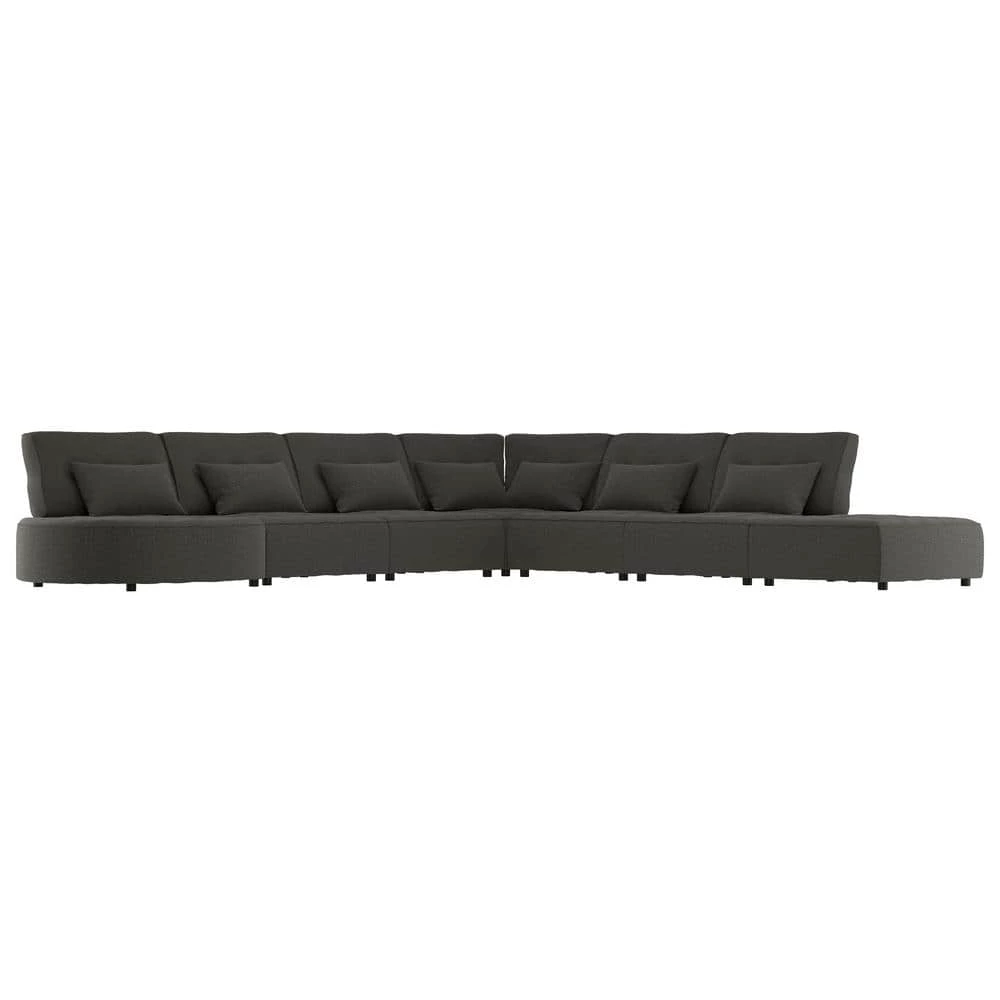 This modern modular sectional sofa has a unique designer look and boasts a combination of straight and curved lines to provide a custom look for your home. The sectional features a corner chair, 4 armless chairs, an ottoman that can be added to the end to create a chaise, plus a rounded armless end chair for a dramatic look. In addition, the sectional has tight seat cushions with button tufted detailing for comfort and style. The versatile modular pieces allow you the flexibility to configure your sectional while the clip connection on the legs will keep the pieces securely attached. Includes 7 accent pillows.