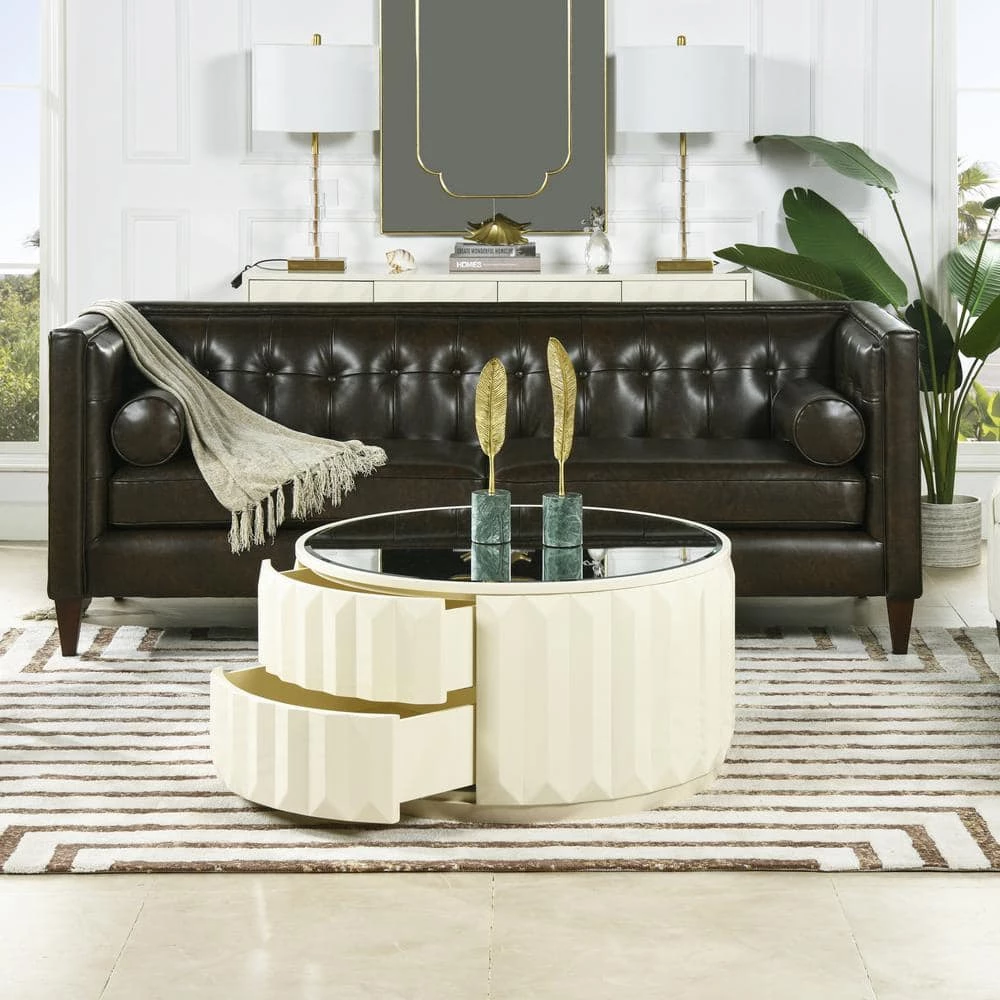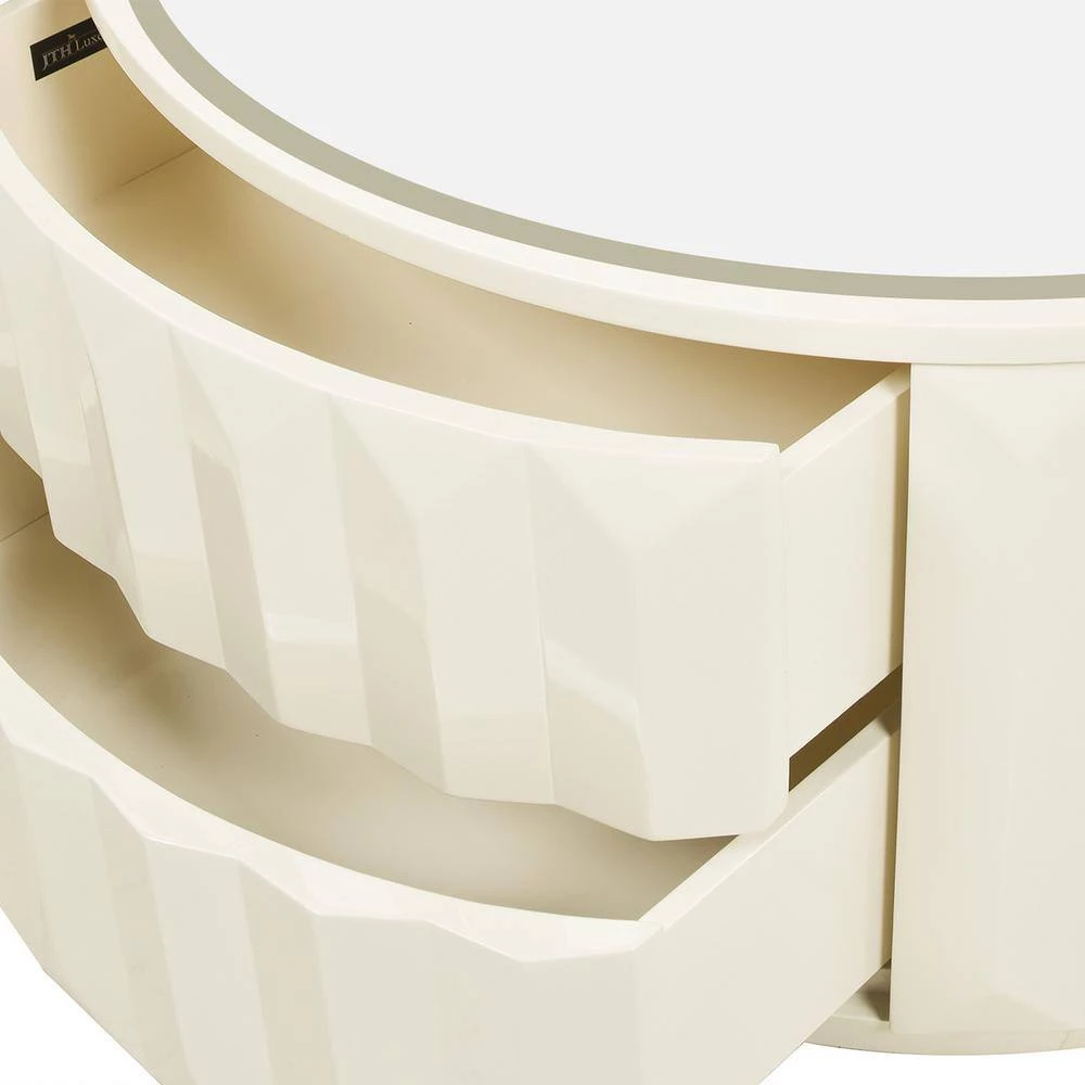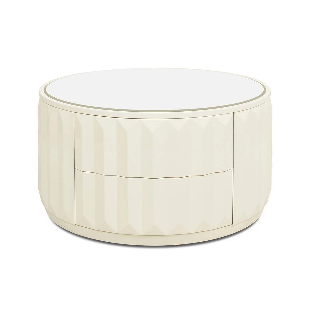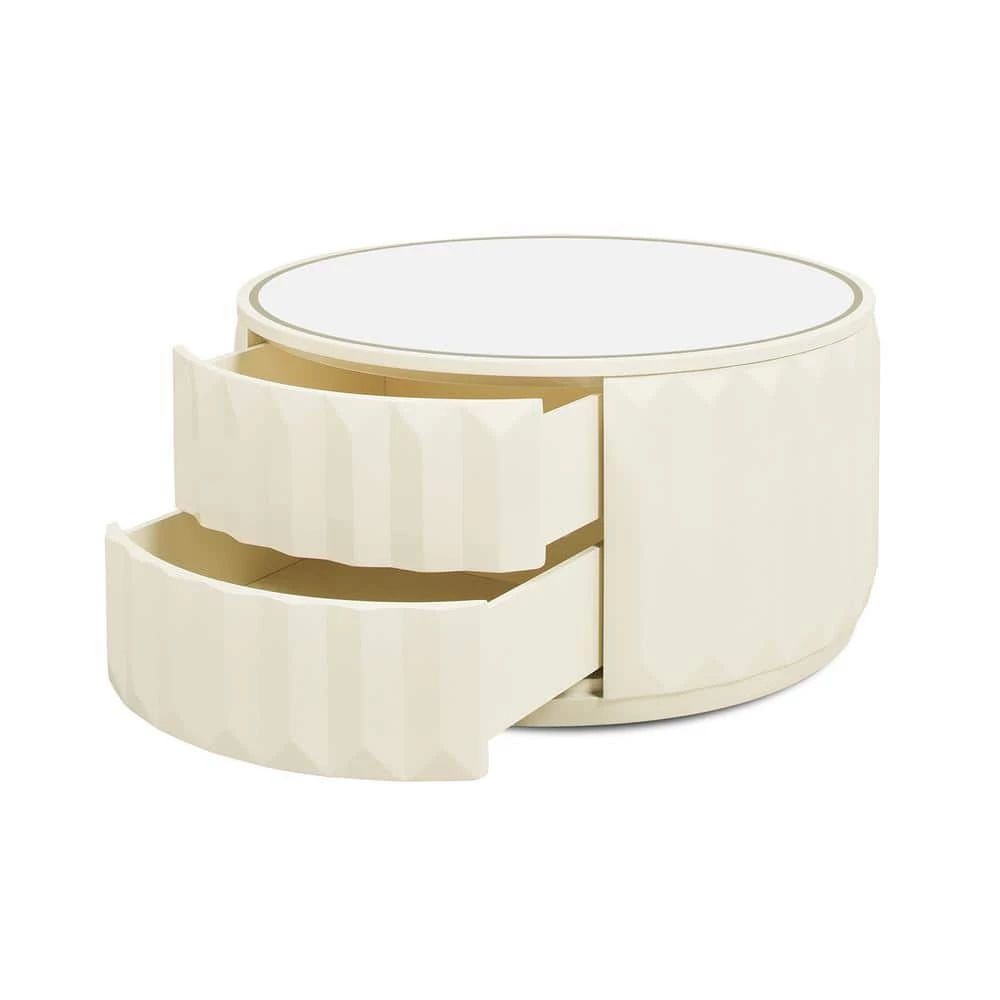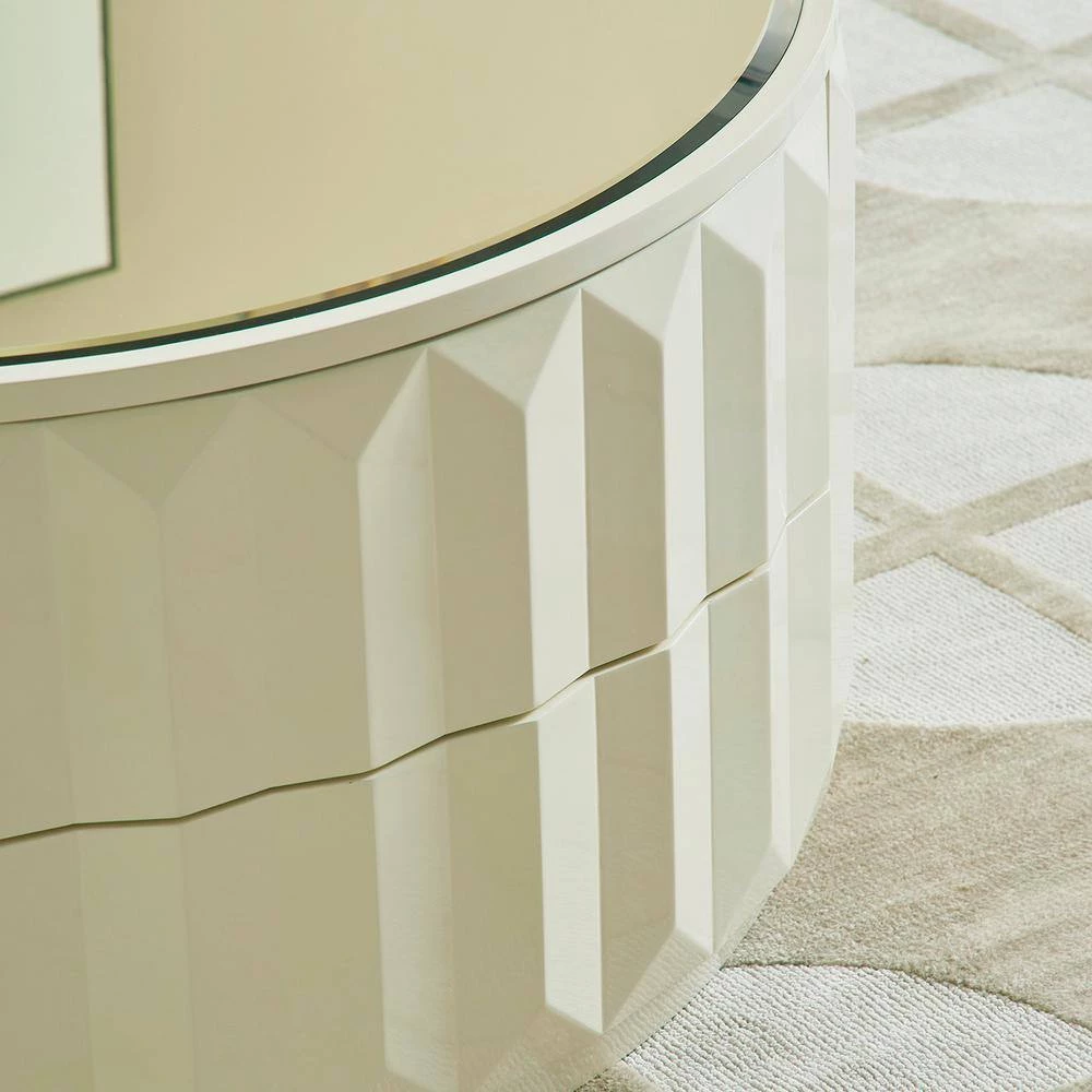 The Facino Collection by JTH LUXE features white laquered wood furnishings with a touch of Mid-Century Modern glamour. The Facino Round Coffee Table showcases a 3D geometric pattern all around the base with two storage drawers with magnetic press-lock closures. The mirrored glass top completes this ensemble for a simple, design-forward piece that is the perfect complement to a modern style. The 35.5 inch diameter pairs nicely with sofas and sectionals.