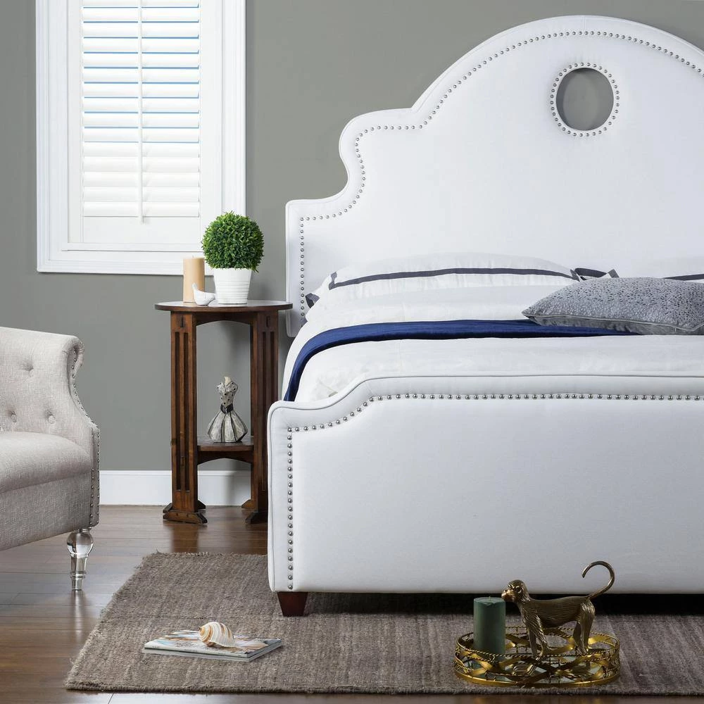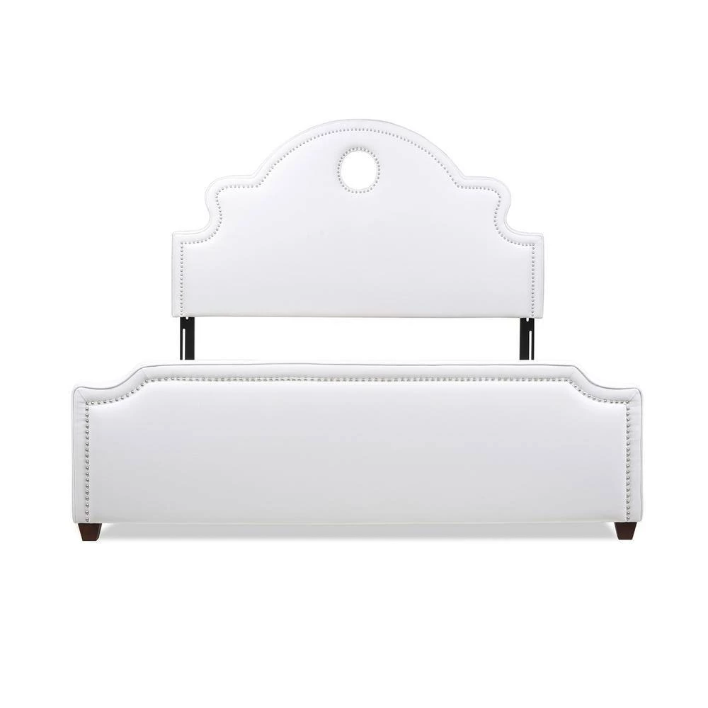 Take your bedroom styling to new heights with the Flora Keyhole Panel Bed by Jennifer Taylor Home. This extra tall headboard features a unique keyhole cutout that is accented by an elegant, curving headboard silhouette, while the end of the bed is finished with a simple, clean-lined footboard. Hand-applied nailheads on both add a glamorous touch. The overall effect makes for a beautiful statement piece in your master suite.