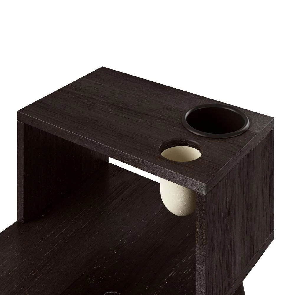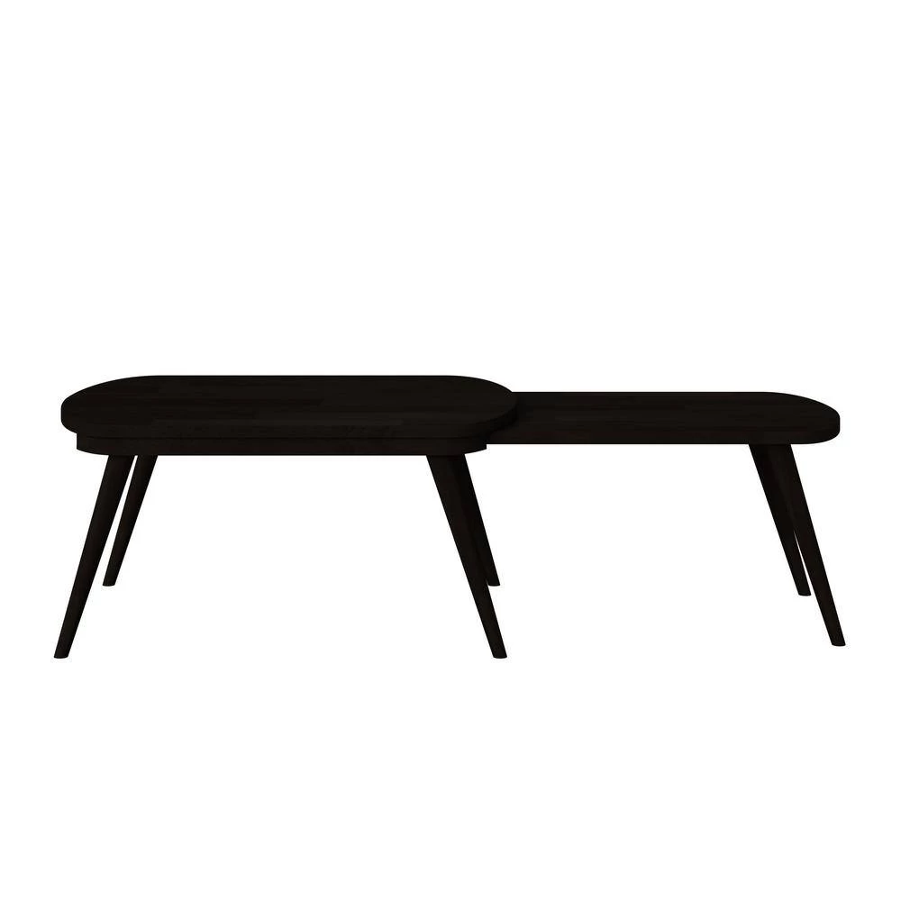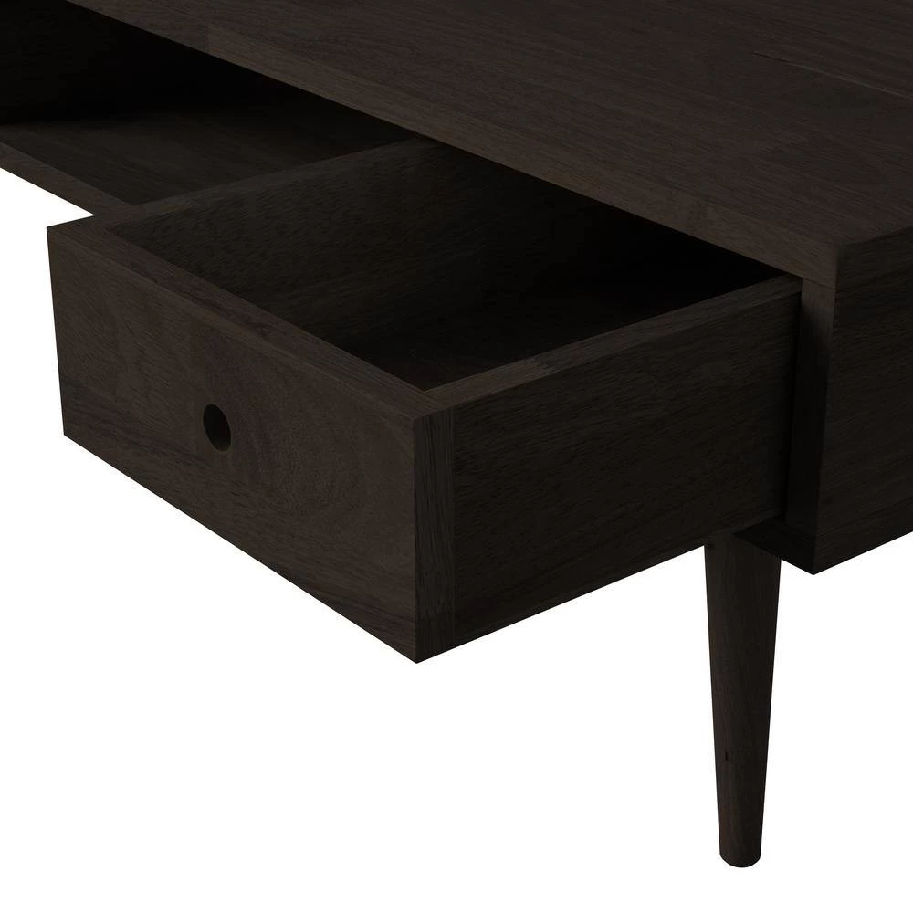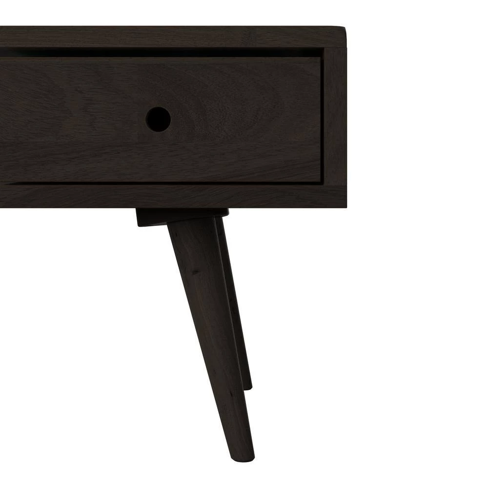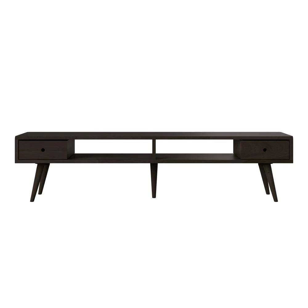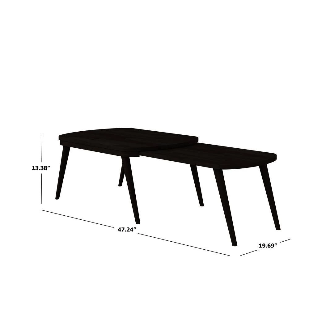 This 4-piece mid-century modern set includes 2-rectangular-shaped end tables, a nesting cocktail table and a TV stand. The solid wood rectangular shaped tables feature an open shelf at the back that has a convenient built in cup holder plus a separate hanging holder that can store coins, pens, etc. This unique square shaped wood cocktail table has an attached table nesting underneath that can be pulled out to expand the length of the table and features 6-round legs that provide support when nested and expanded. The TV stand is 14.25 inches high, the perfect height for viewing. The solid flat rectangular top can accommodate a 58 inch wide flat-screen TV and the 2-open shelves and 2-drawers are just what is needed to house electronics. Full assembly required with included tool, instructions and Phillip’s screwdriver (not included). Imported, color may vary.