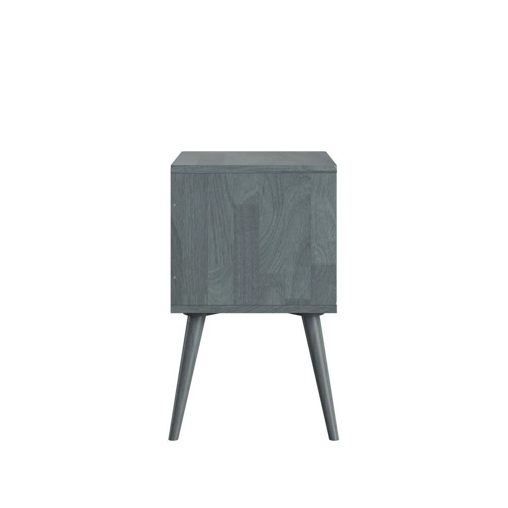 - Table features a single door with a cut-out circle handle and round flared legs