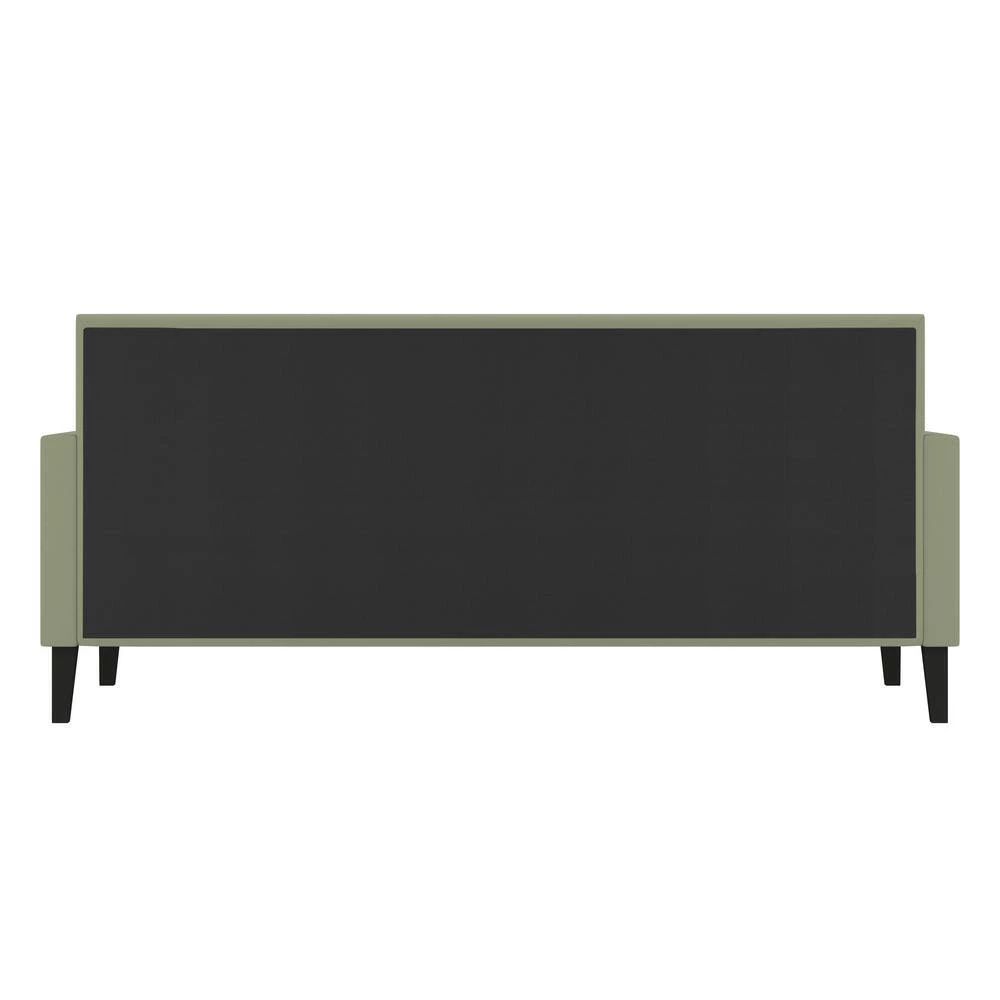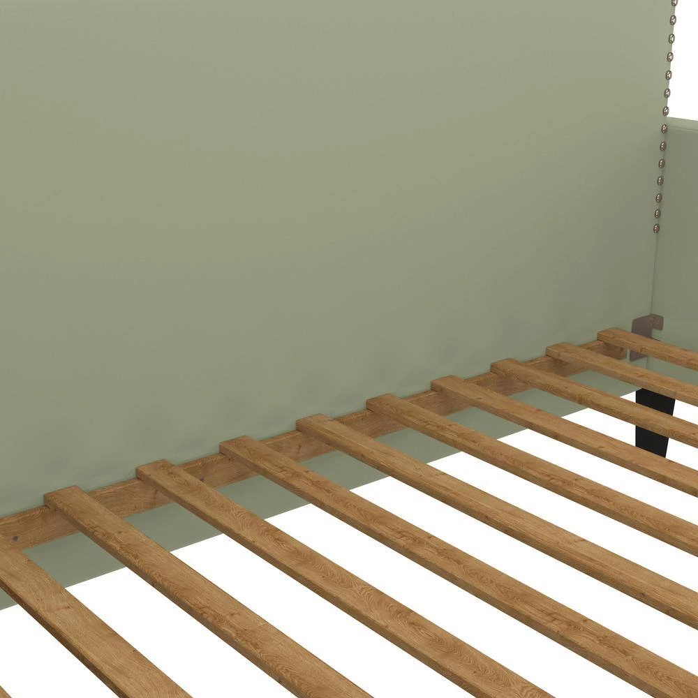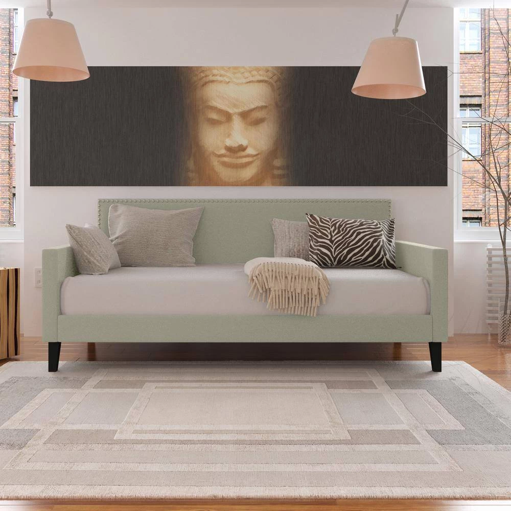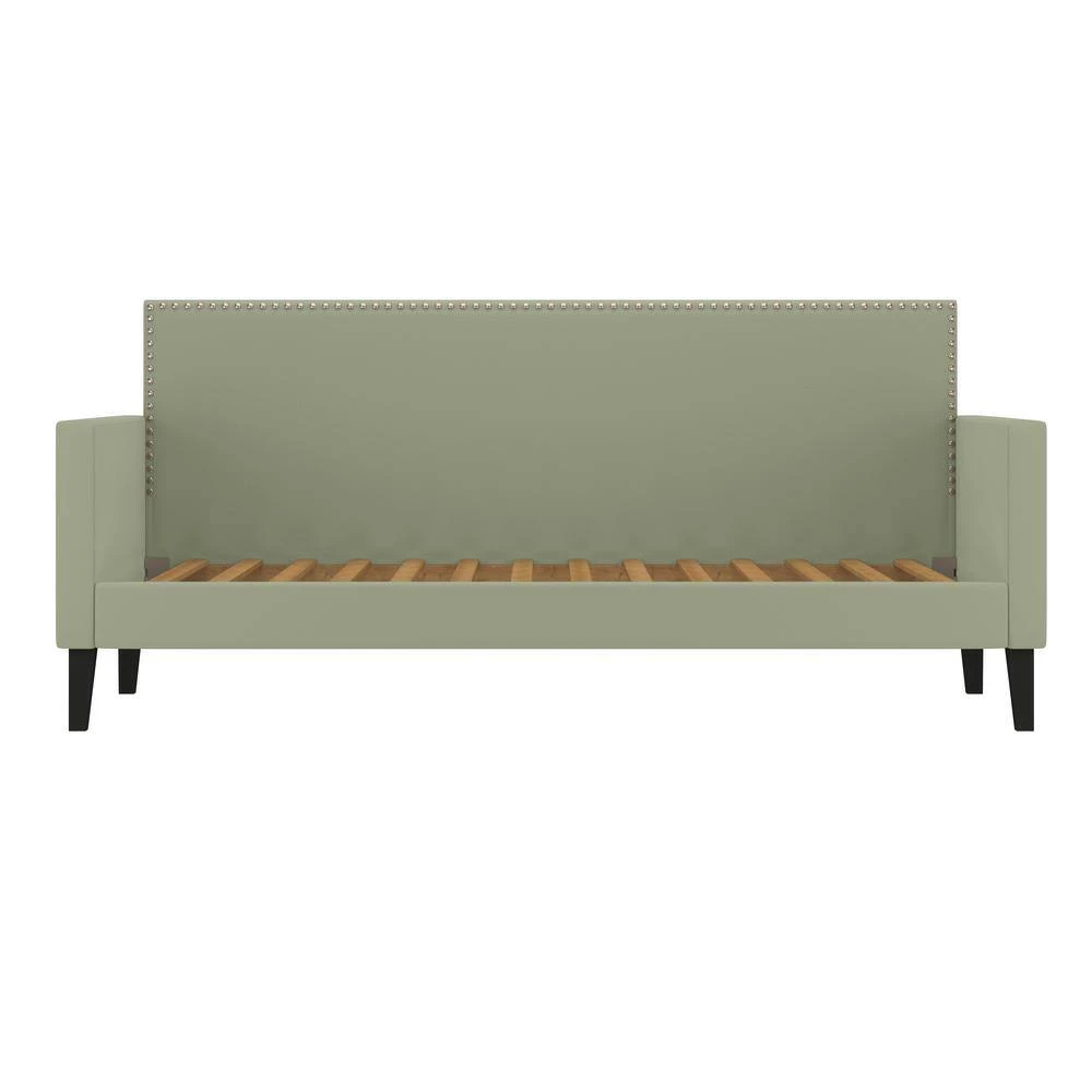This beautiful contemporary daybed is the perfect platform to hold your standard twin size mattress. The daybed features a square upholstered back adorned with pewter nail head trim, square track arms and tapered wood legs in a black finish. Covered in a durable, easy clean 100% polyester soft to the touch fawn gray velvet-like fabric. Update your bedroom or spare room decor with this upholstered daybed with wood slats. To evenly distribute weight, 1 3/4-inch wide MDF slats run horizontally from side to side. The daybed is designed to make a great couch as well as a comfortable bed. Imported, color may vary.