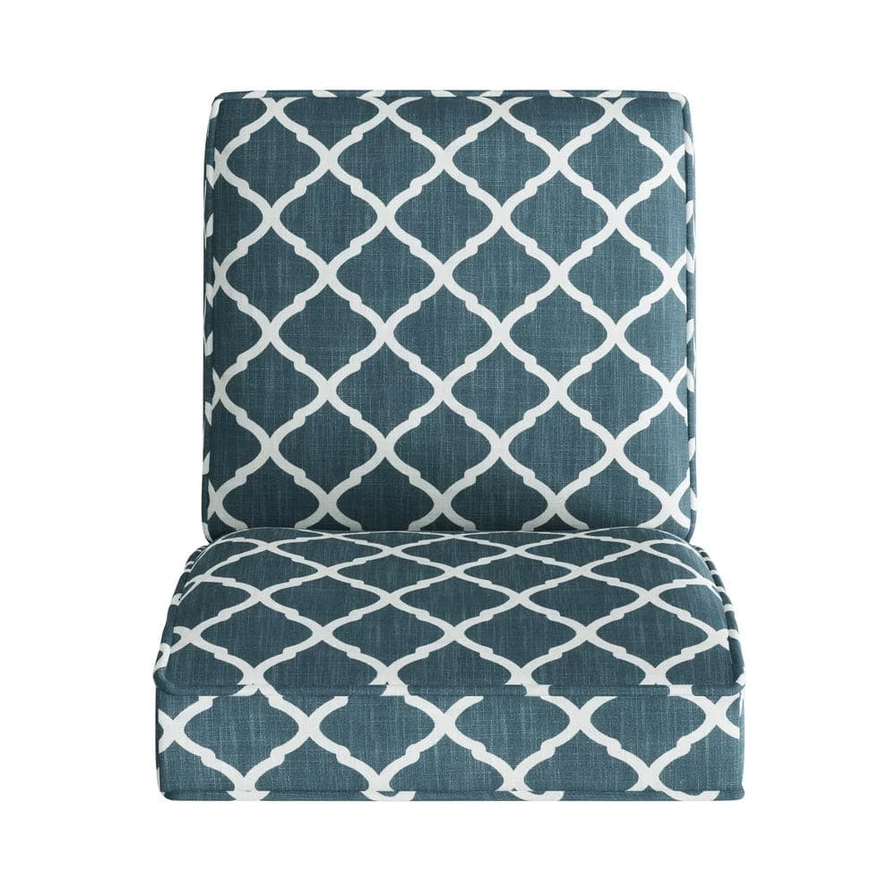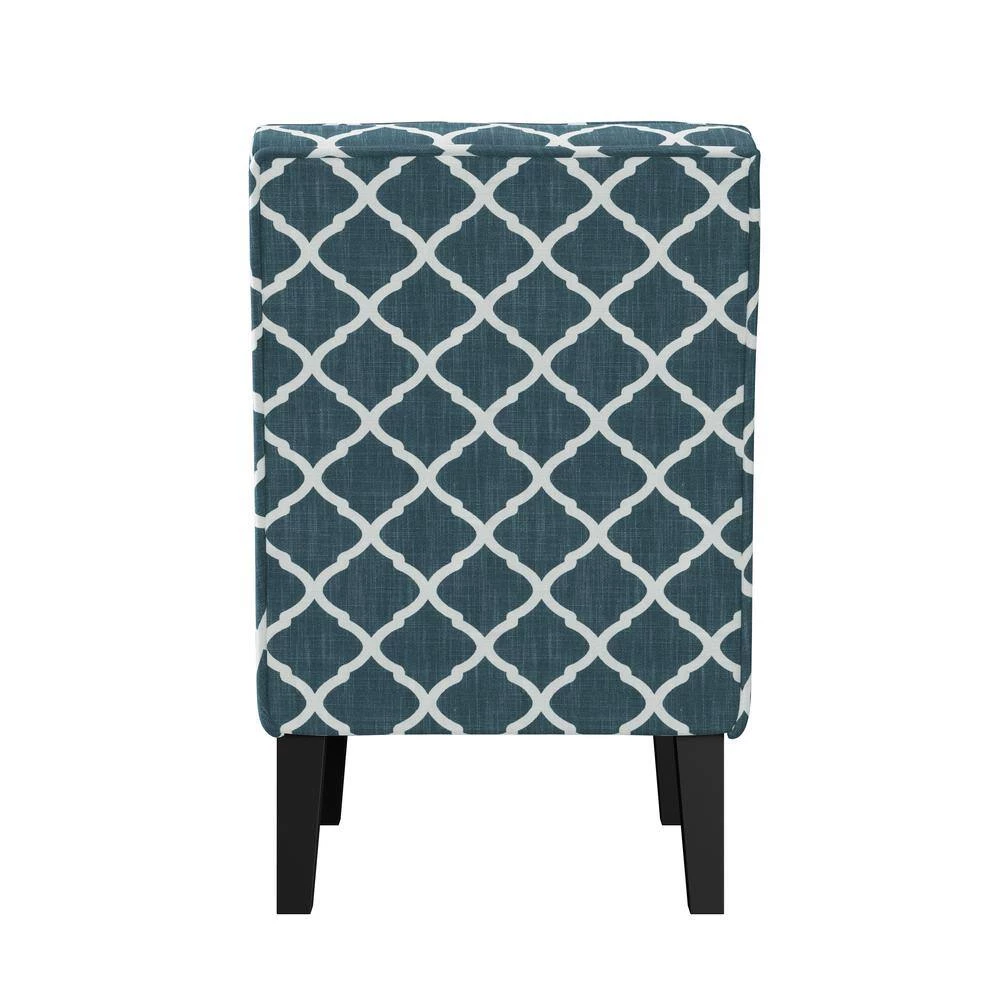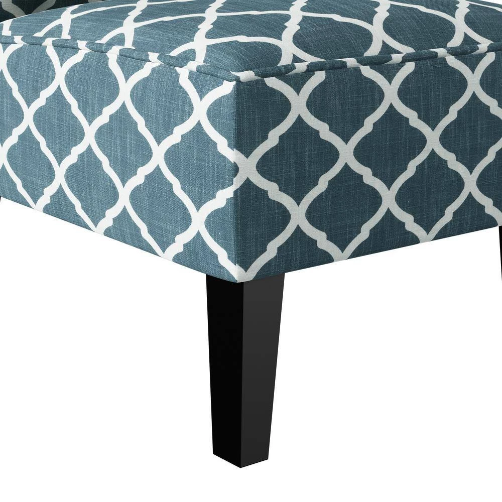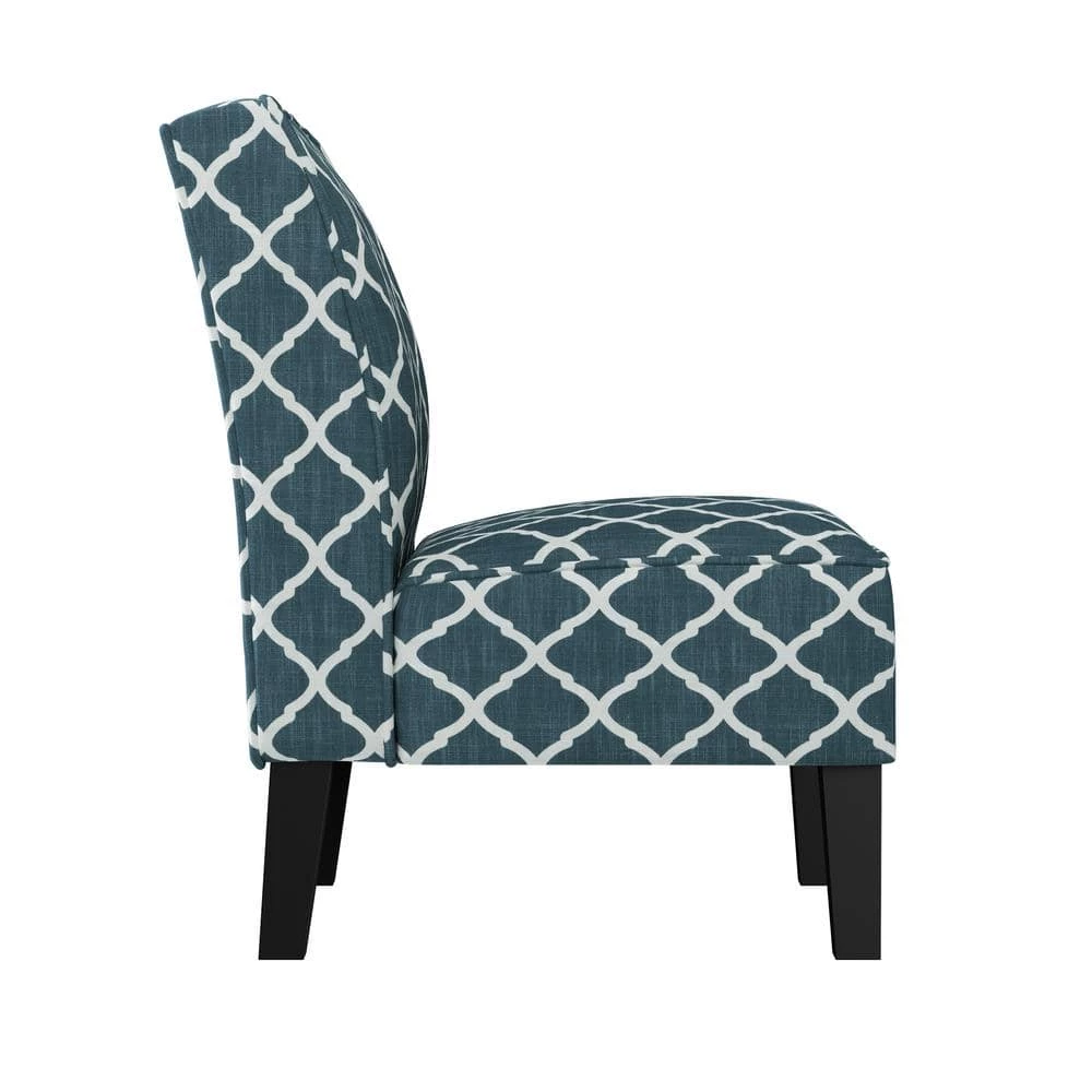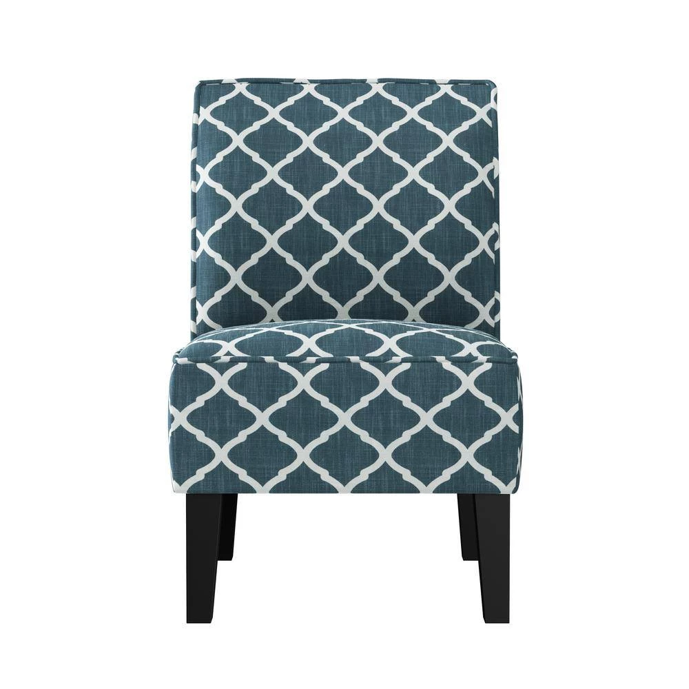 This slipper chair features a curved square back, sinuous springs and deep seating with a thick foam cushion for extraordinary comfort. Covered in a 30% linen, 30% polyester, 40% viscose fabric in a navy blue and creamy white trellis pattern. Extra thick high resilient foam back cushion that is fiber wrapped to ensure total comfort. Ships in one (1) box. Takes less than 15 minutes to assemble with included tool and instructions. Imported, color may vary.