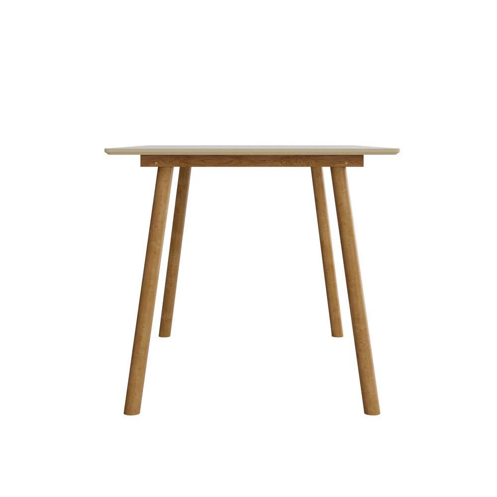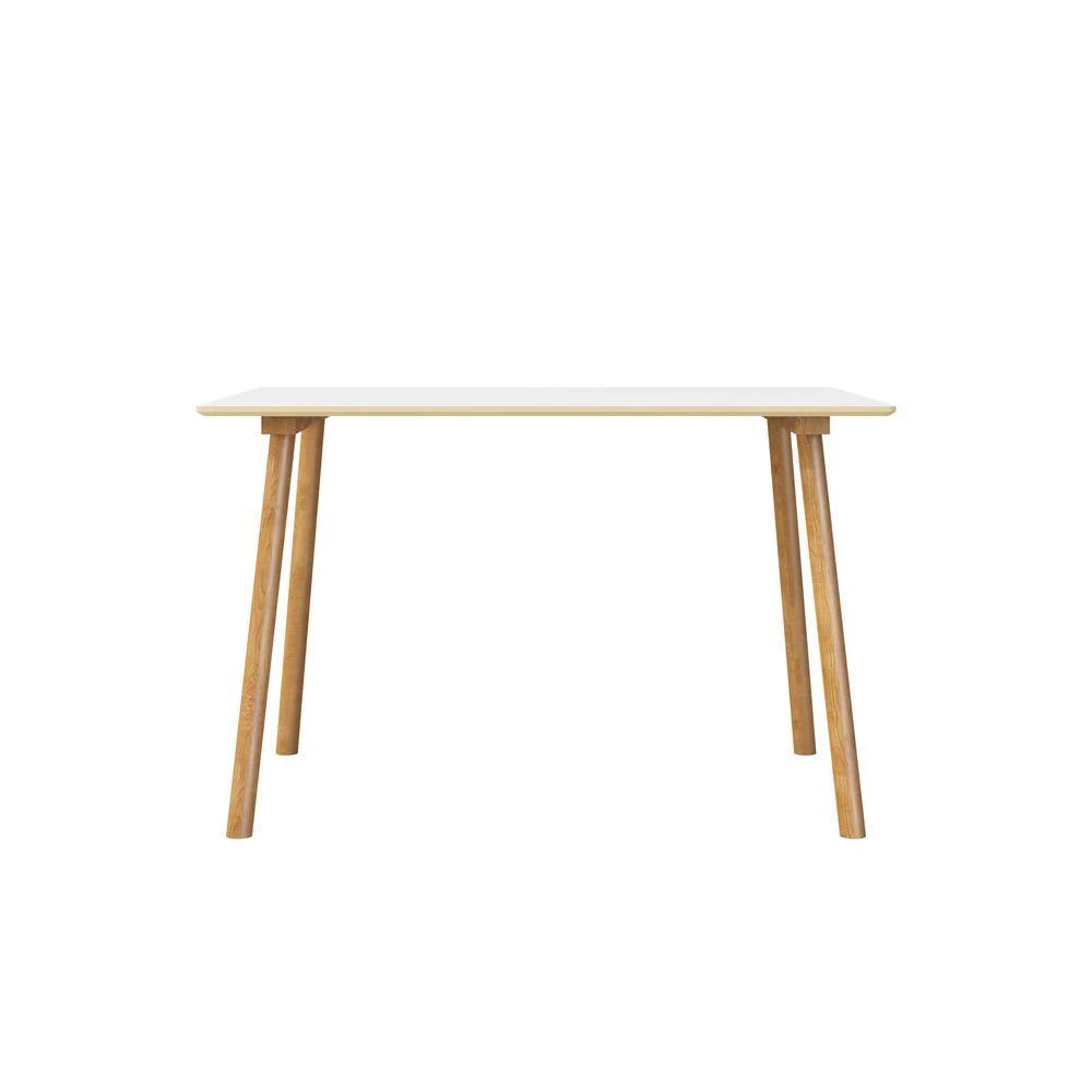 This rectangular table gets its mid-century modern sensibility from clean, minimalistic lines. Crafted with a sturdy engineered wood tabletop, it’s detailed with a sleek, beveled edge. The table seats up to 4 comfortably, making it a great option for small-space living. Easy assembly, simply attach the legs. Imported, color may vary.