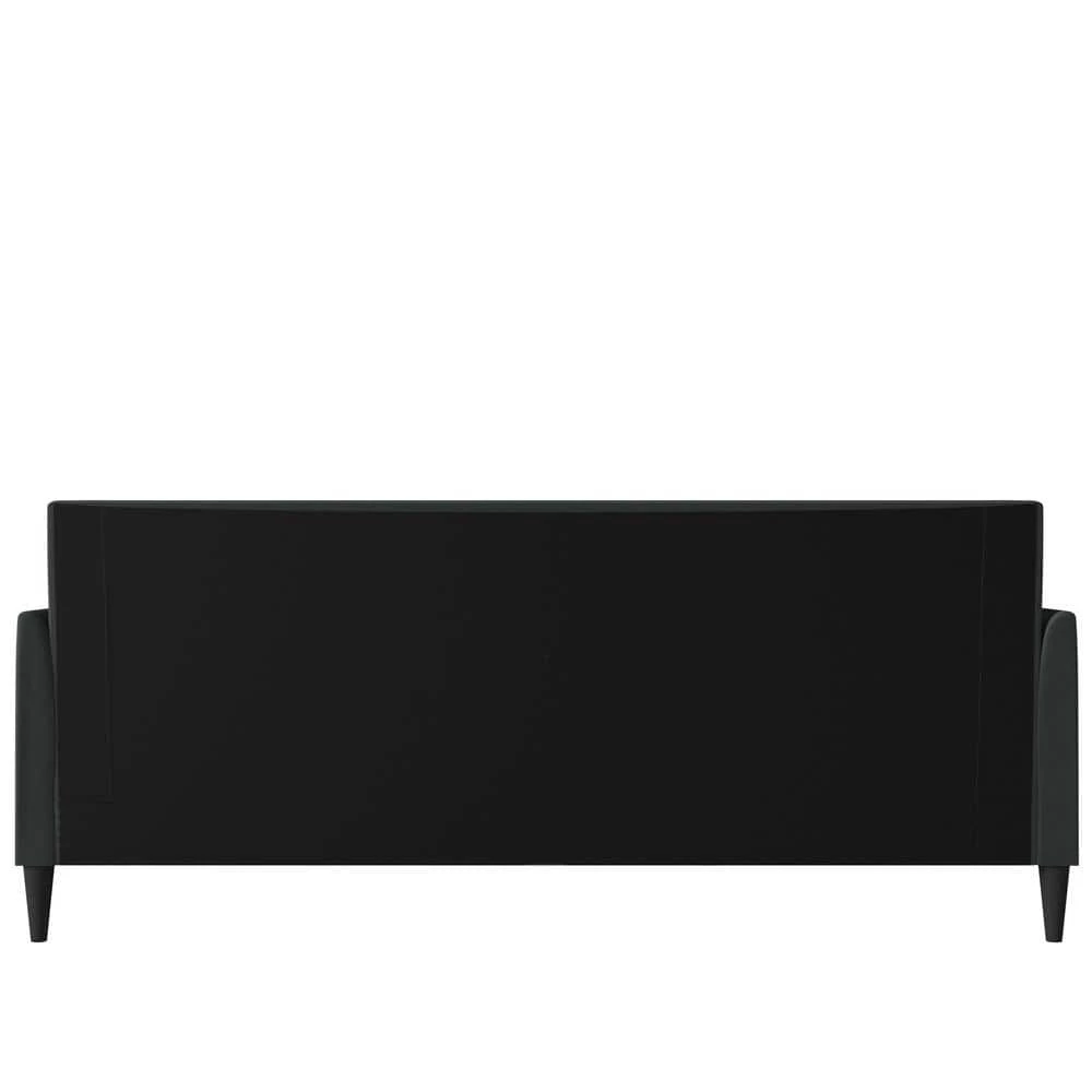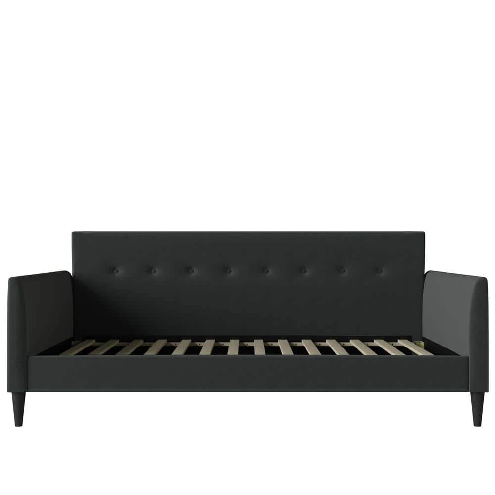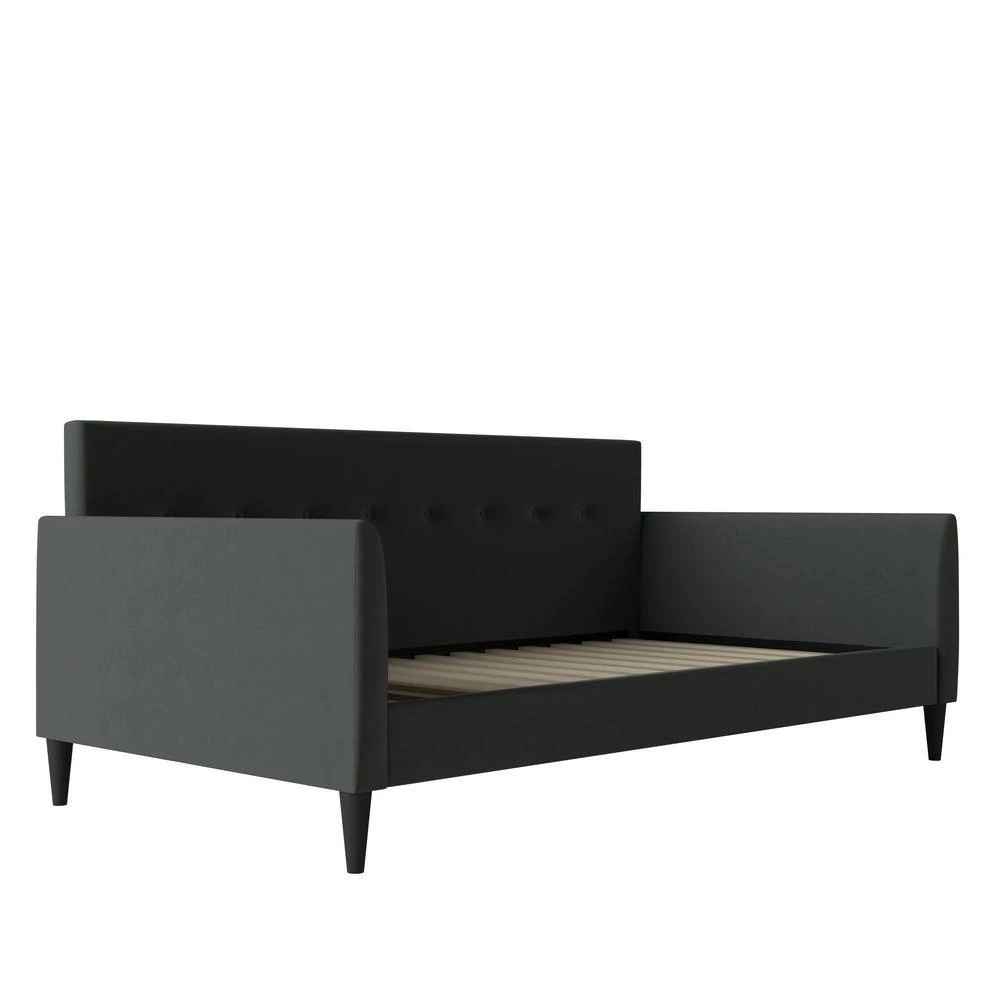 This beautiful mid-century modern style daybed is the perfect platform to hold your standard twin size mattress. The upholstered daybed features a square button tufted back, square track arms and tapered wood legs in a black finish. Update your bedroom or spare room decor with this upholstered daybed with wood slats. Covered in a durable, easy clean 100% polyester soft velvet charcoal gray fabric. To evenly distribute weight, 1 3/4- in. wide MDF slats run horizontally from side to side. The daybed is designed to make a great couch as well as a comfortable bed. Imported, color may vary.