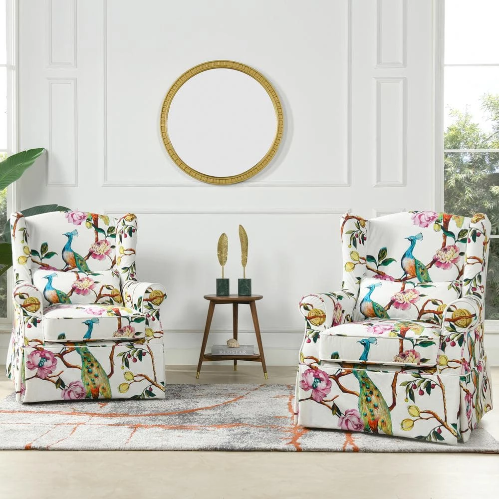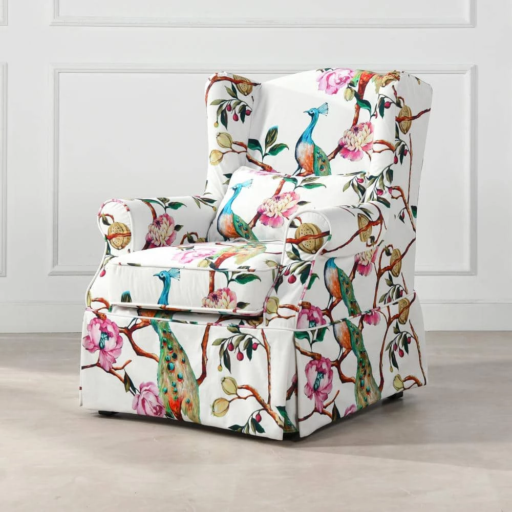 Invite the vibrant colors found in nature inside with the Indie Wingback Armchair by Jennifer Taylor Home. The beautiful floral pattern features India’s blue peacock on a bright white background for an eye-catching pop of color and life to a boho chic home. The high back, shelter silhouette, and lumbar pillow come together for a delightful seating experience, and the chair is finished with a crisp, pleated skirt for a polished look. The chair is slipcovered for easy cleaning and the seat cushion is removable with a zippered cover.