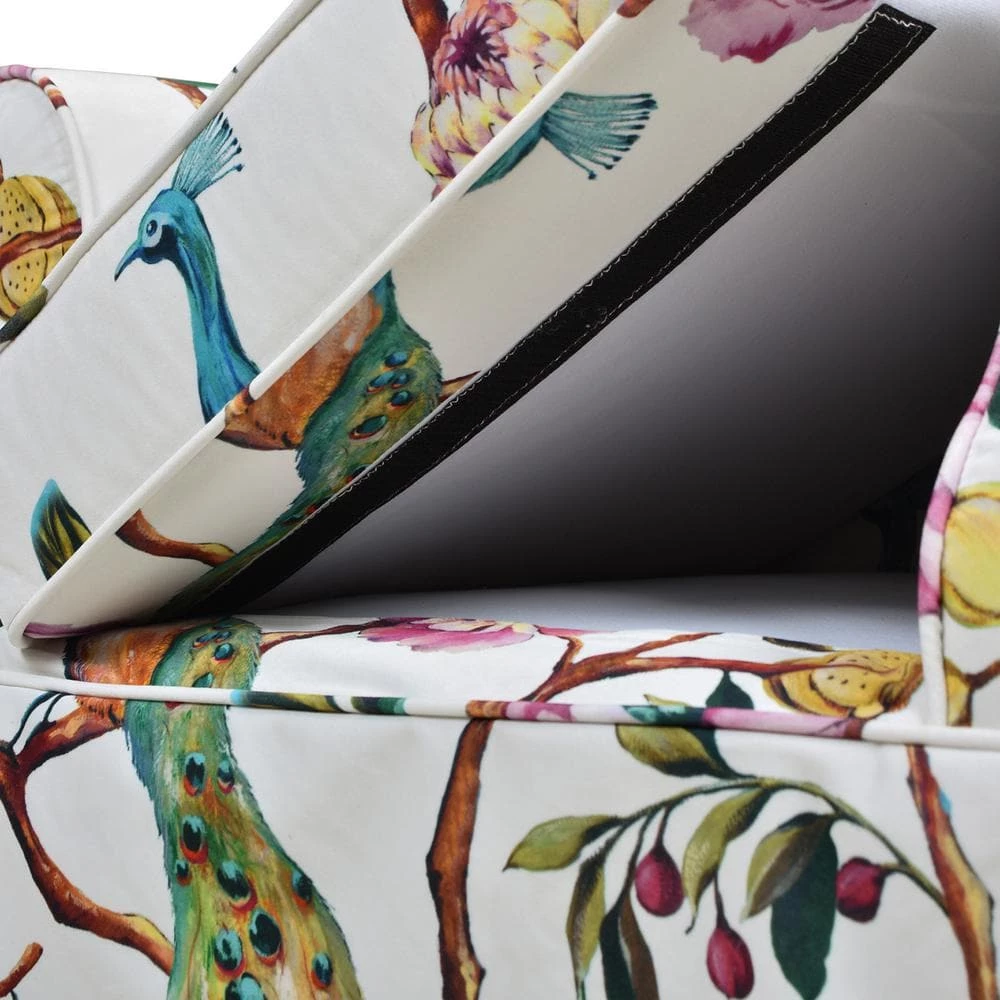 - Slipcovered upholstery in a wrinkle and fade resistant peacock floral pattern polyester for durability and easy maintenance