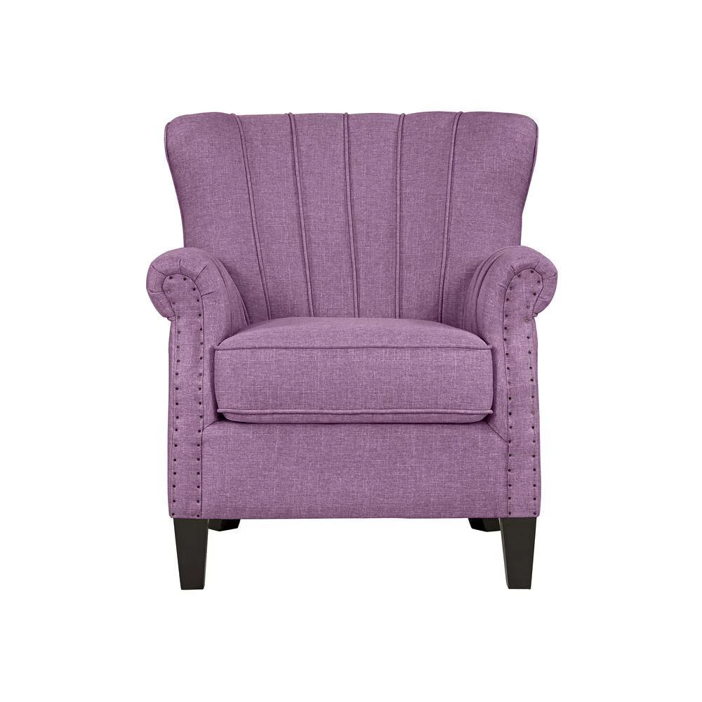 This arm chair boasts a classic rolled arm design adorned with hand-hammered exposed brads that reflect artisan tailoring that will compliment a variety of home styles. The chair features a squared channel tufted back design with a box seat cushion for extraordinary comfort and designer styling. Easy assembly, simply attach the legs. Imported, color may vary.