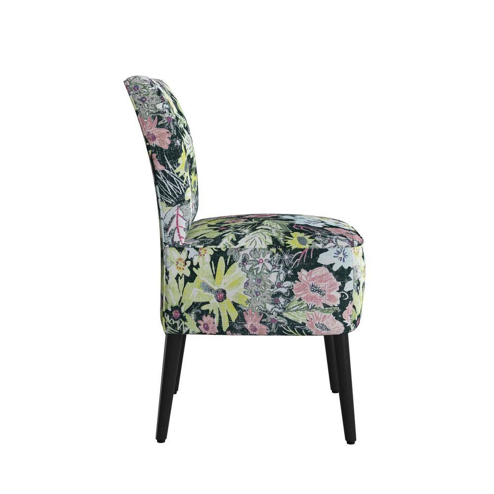 With its curved back and thick seat cushion, this is a chair that will stand out and be noticed. This armless chair is complemented with solid wood legs in a dark espresso finish for strength and style. Covered in a durable, easy clean, pet friendly 100% polyester linen-like fabric. Takes less than 15-minutes to assemble with included tool and instructions. Imported, color may vary.