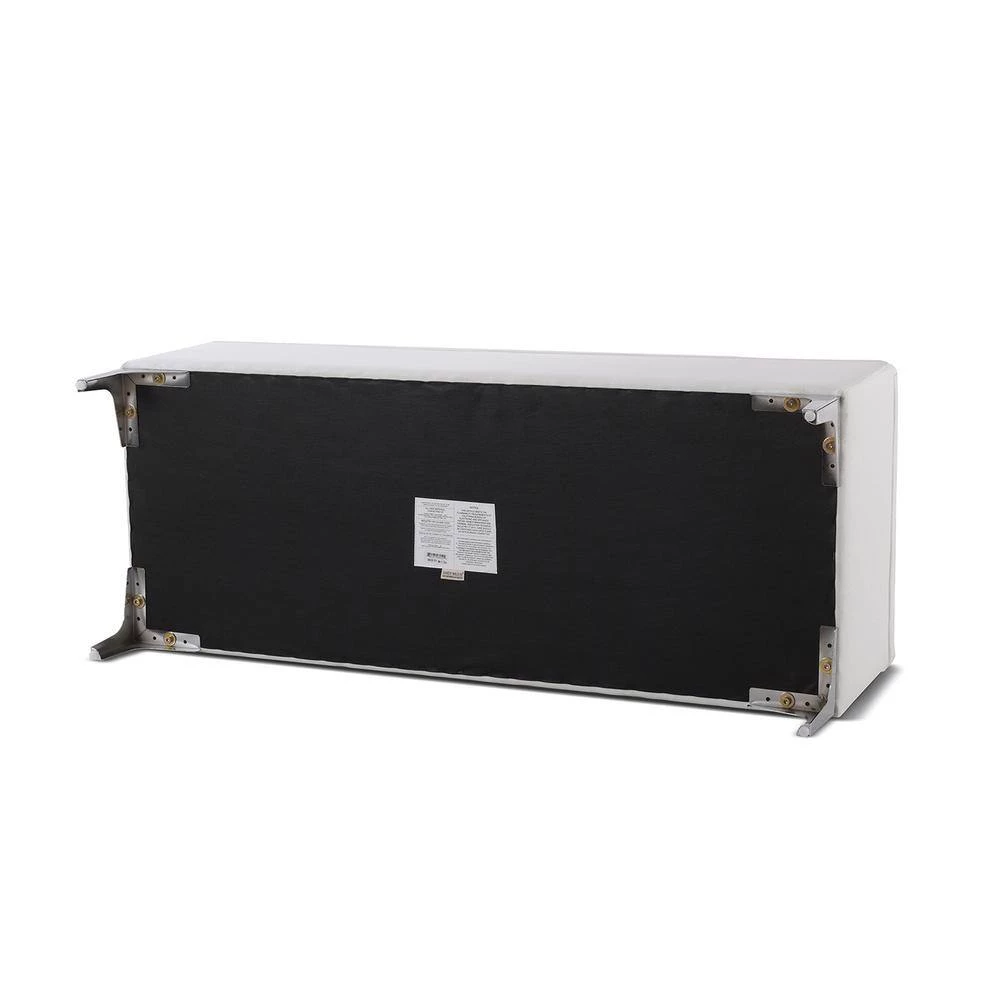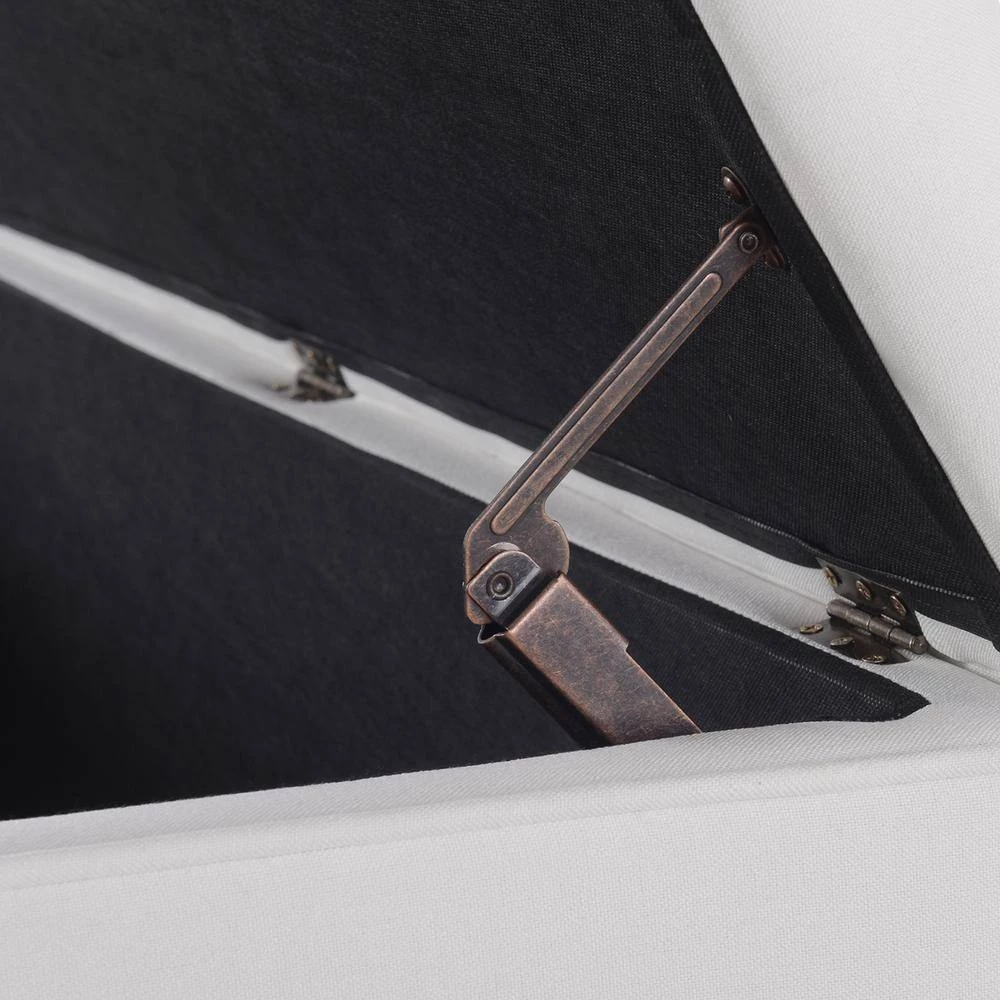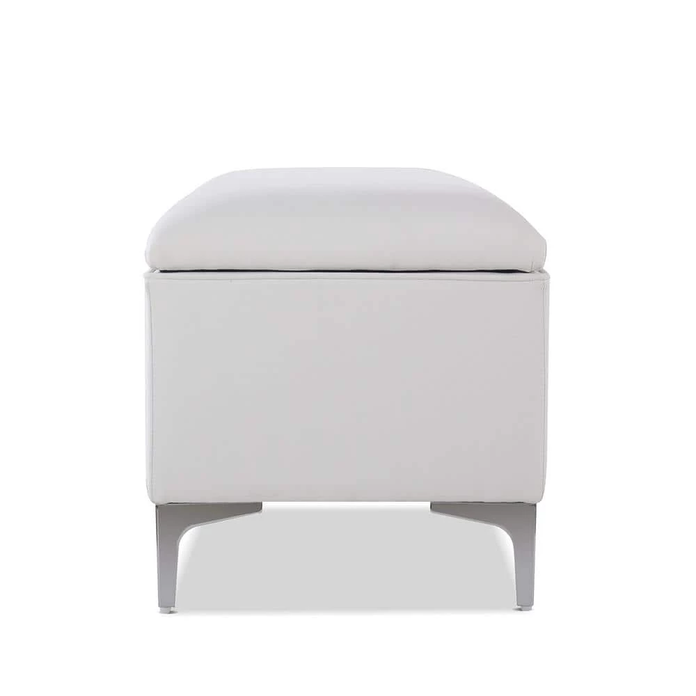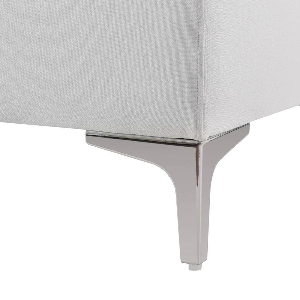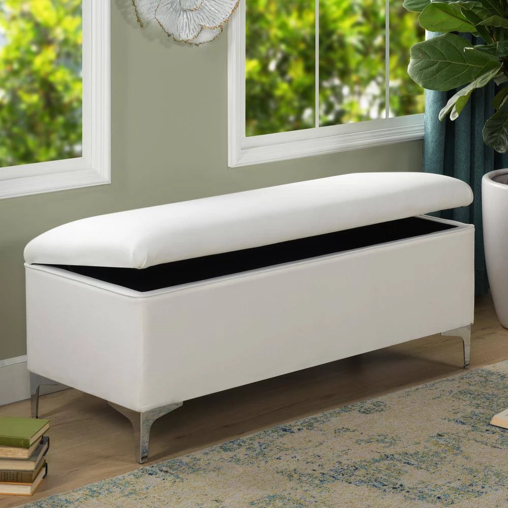 Modern and functional. The Madelyn Collection storage bench by Sandy Wilson Home offers a clean tailored look and constructed with premium quality materials. The hinged lid opens to reveal ample storage space for your winter comforter, pillows, or anything else you may want put away. This storage bench can withstand daily and frequent use thanks to its sturdy frame made from solid birch and 11-layer plywood upholstered in premium durable fabric and high quality foam padding. Holding everything up are 4 ultra strong iron legs finished in Polished Zinc with glides to protect your flooring. Versatile enough to be placed in the bedroom, entryway, or hallway, the Madelyn storage bench is one you will want in every room.
