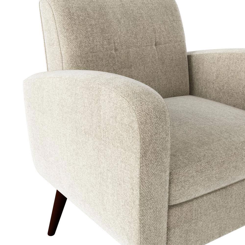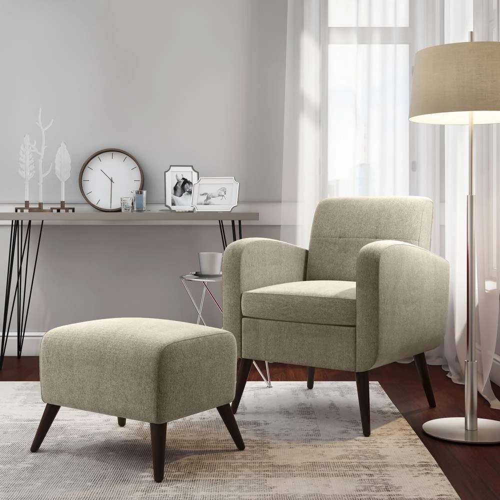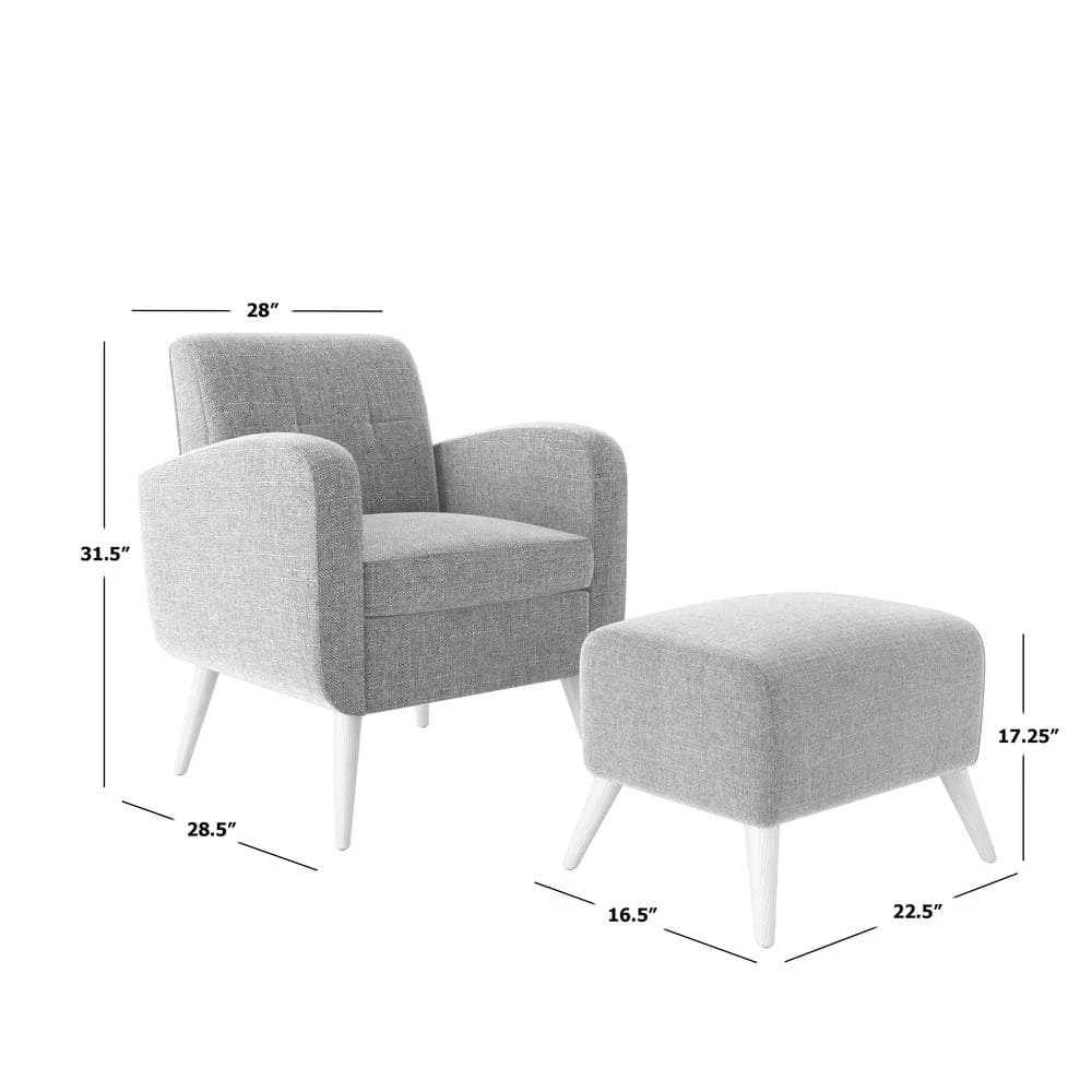Relax in style with this modern arm chair and ottoman set that is covered in a velour fabric. The chair features squared arms that curve down towards the lace tufted back and cushion. Both the chair and ottoman feature solid wood round legs in a dark brown finish that slightly flare out to complete the look. This chair and ottoman will be a great addition to update your living room, family room, bedroom or home office. Both pieces ship in 1-box. Easy assembly in less than 30-minutes with included tool and instructions. Imported, color may vary.