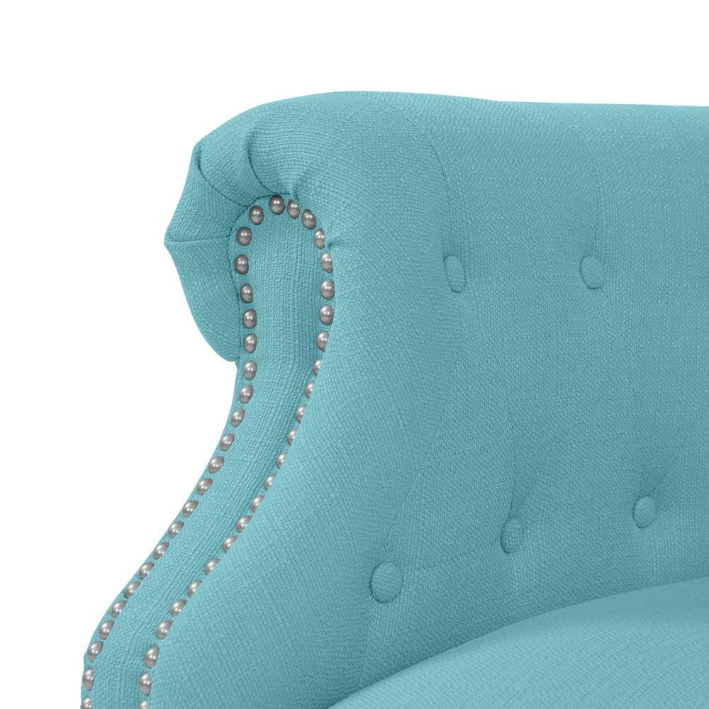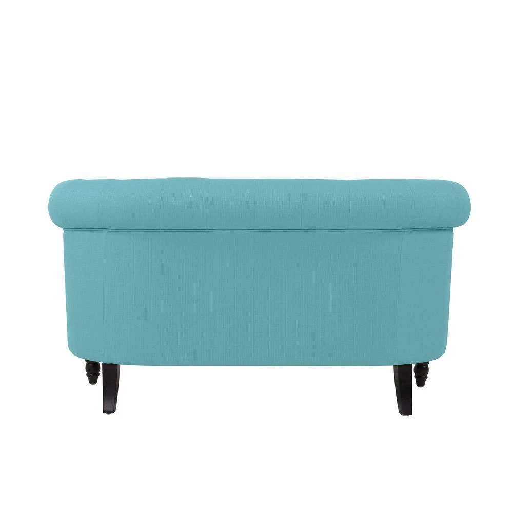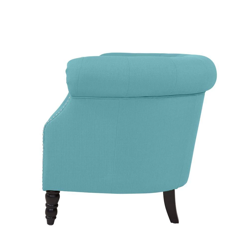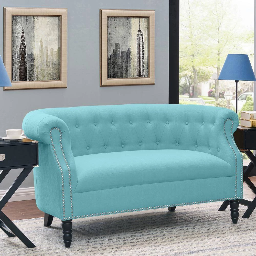 This transitional loveseat features a Chesterfield design with a button tufted back accented with rolled arms and hand tacked pewter nail head trim. The rolled arms flow seamlessly throughout the back. Ships in one (1) box. Fully assembled, simply attach the legs. Imported, color may vary.