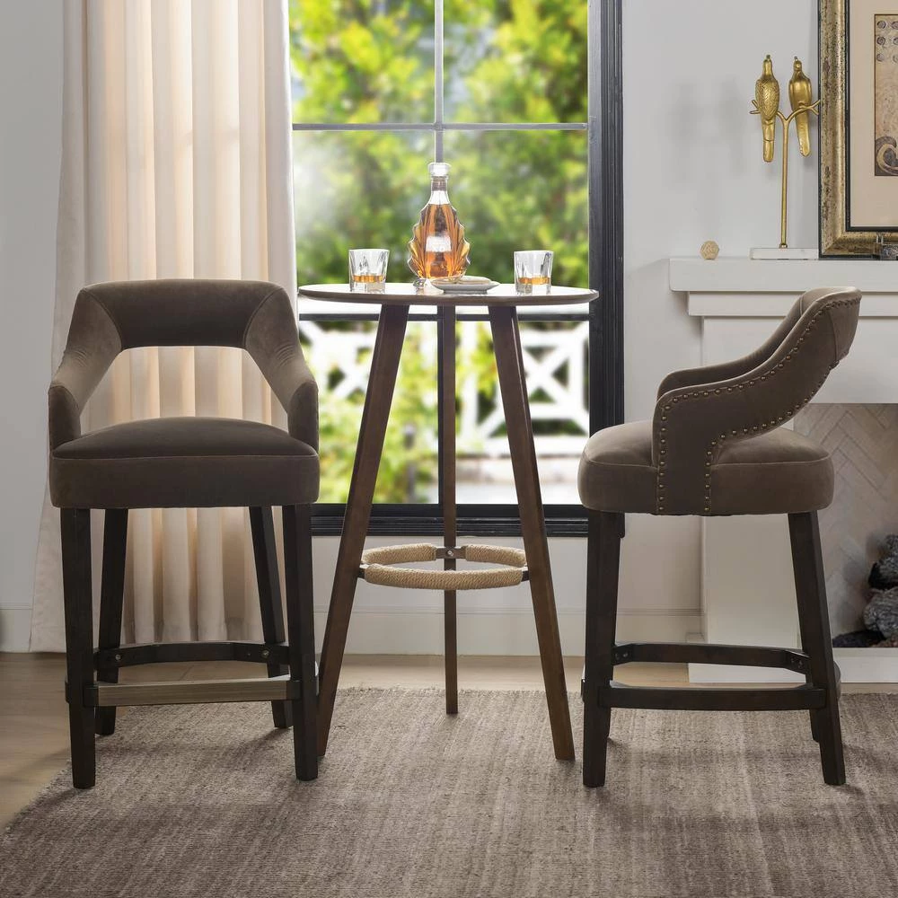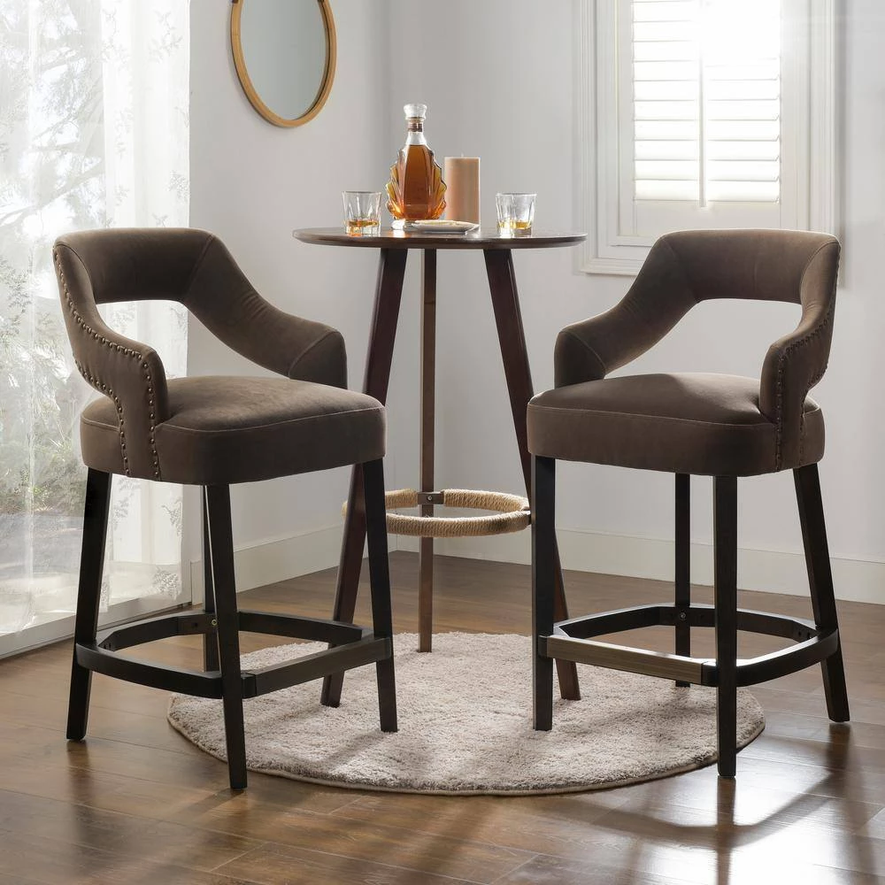 Elegantly modern, the Moderne Upholstered Bar Stool Collection features plush, comfortable seating that doesnt skimp on style. Fully upholstered with luxurious velvet atop a medium-firm foam seat, these 26 high bar stools work great with kitchen counters, high tables, or anywhere you need seating with a little extra height. Attractive nailhead accents line the arms and back of this stool, and a brass kickplate helps prevent scuffs and scratches to the dark espresso legs. Every purchase includes 2 bar stools for the perfect pairing for your home. Due to the many variations in monitors and browsers, colors may appear different on different monitors. Since it is not possible to guarantee our online colors will look the same on all computers, we do not guarantee that what you see accurately portrays the color of the actual product. If it is important that the sample be exact, we highly recommended that you order a swatch sample first, before placing the order.