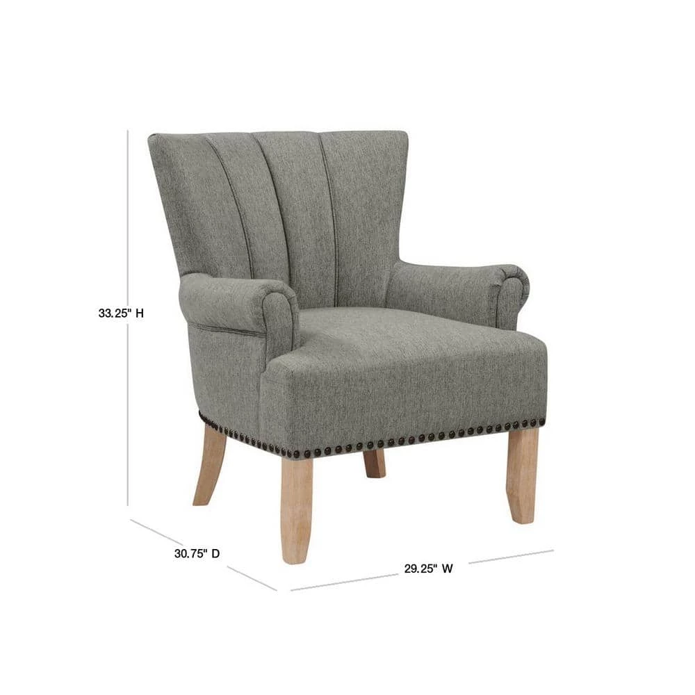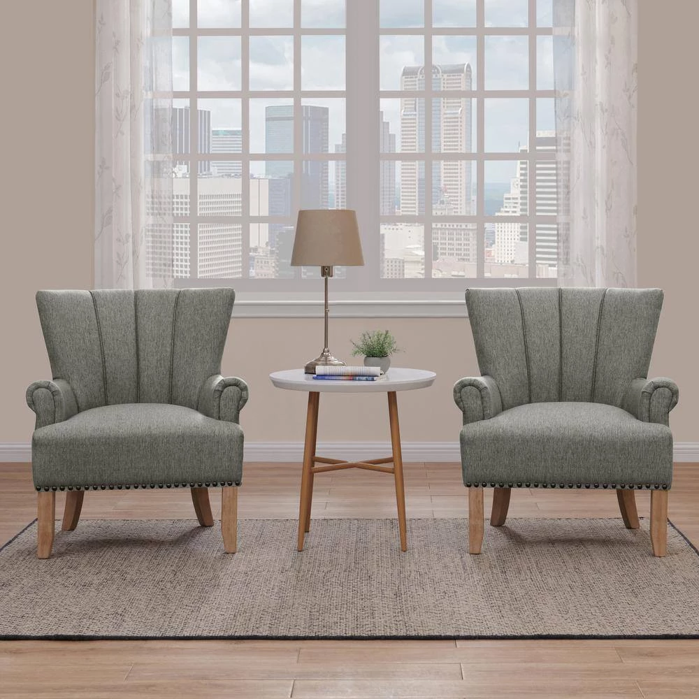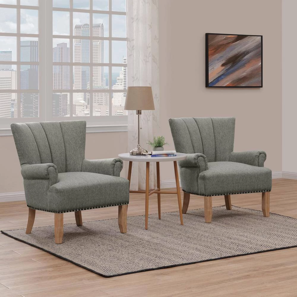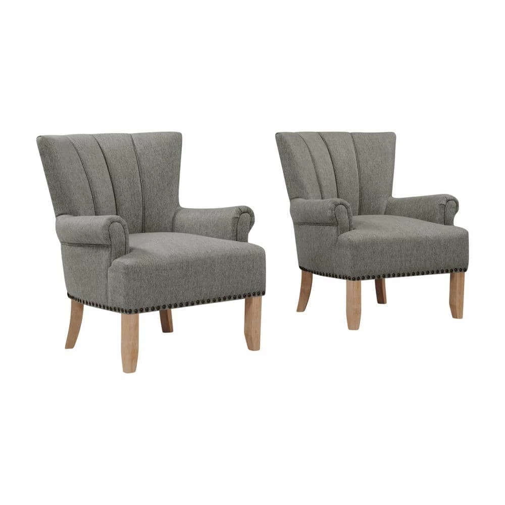 This sophisticated set of 2 updated traditional arm chairs features a channel tufted squared back with rolled arms and is accented with hand tacked bronze nail head trim along the bottom of the chairs. Perfect for a living room, bedroom or office, these chairs are not only comfortable but will elevate the look of your home. Covered in a 100% Polyester linen-like Performance fabric. With our exclusive “Never Fear” fabric finish, you can rest assured your fabric will stand up to your family’s dirt and wear and tear. “Never Fear” resists stains and has the quality to pass commercial durability standards. Ships in one (1) box. Imported, color may vary.