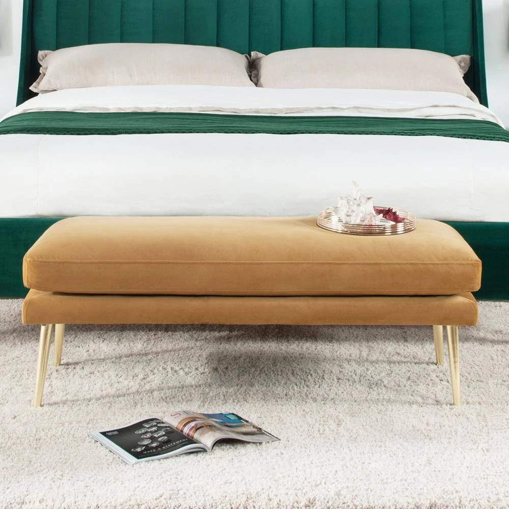 Glamorous and stylish are what best describe the Oliver Entryway Bench Collection by Sandy Wilson Home. You would think the dazzling looks of this modern mid-century style bench with its polished gold legs and plush down pillow top cushion belong in the lobby of a posh hotel or spawhy not bring that look home to your own living room for yourself to enjoy and impress your guests. Handmade with rich luxurious fabrics and a solid wood frame for exceptional quality that will last.
