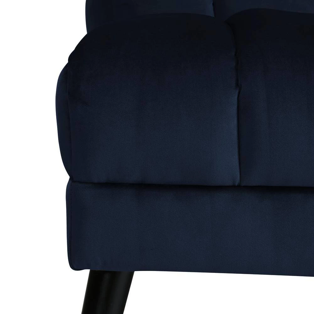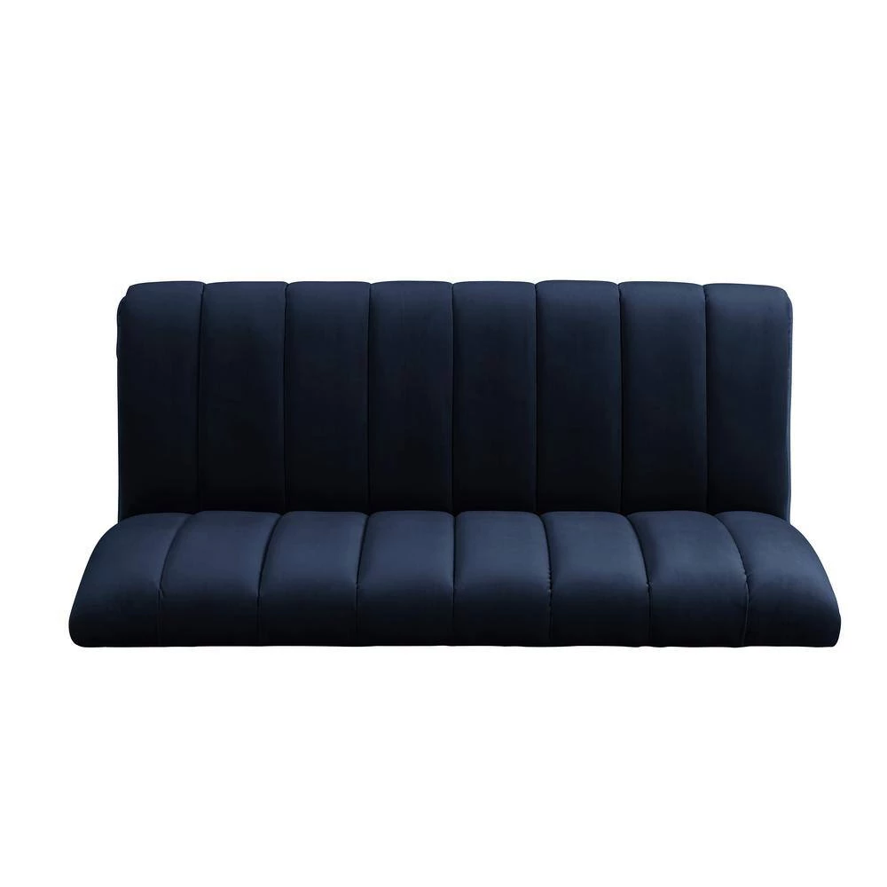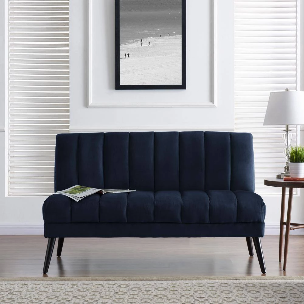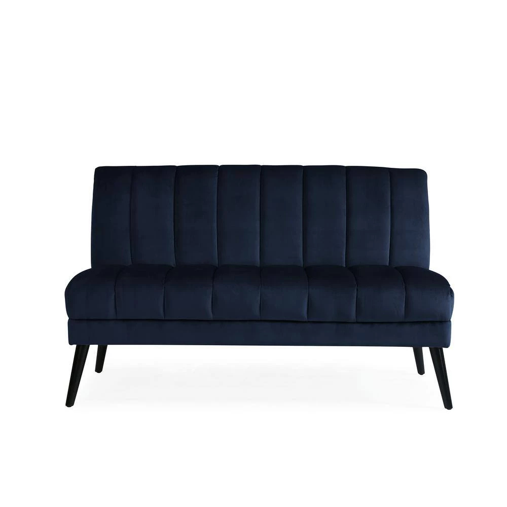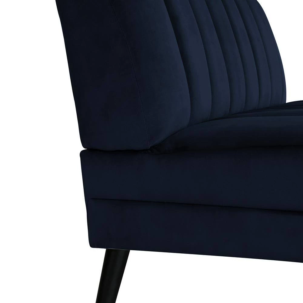 This armless loveseat boasts a mid century modern design that will elevate your home. The loveseat features a square back with channel tufted design, sinuous springs and a thick foam cushion for extraordinary comfort. Covered in a durable, easy clean 100% polyester soft to the touch navy blue velvet-like fabric. Ships in 1-box. Imported, color may vary.