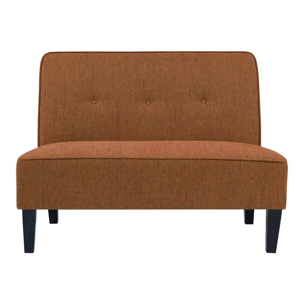 This button tufted settee features a transitional design with a curved square back that is highlighted by three buttons. Covered in a 100% polyester tweed fabric. Takes less than 15 minutes to assemble with included tool and instructions. Imported, color may vary.