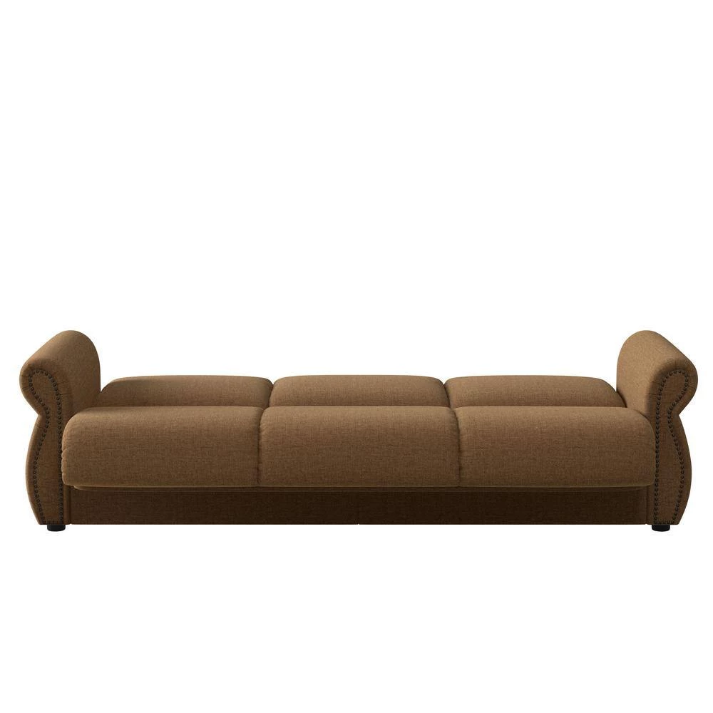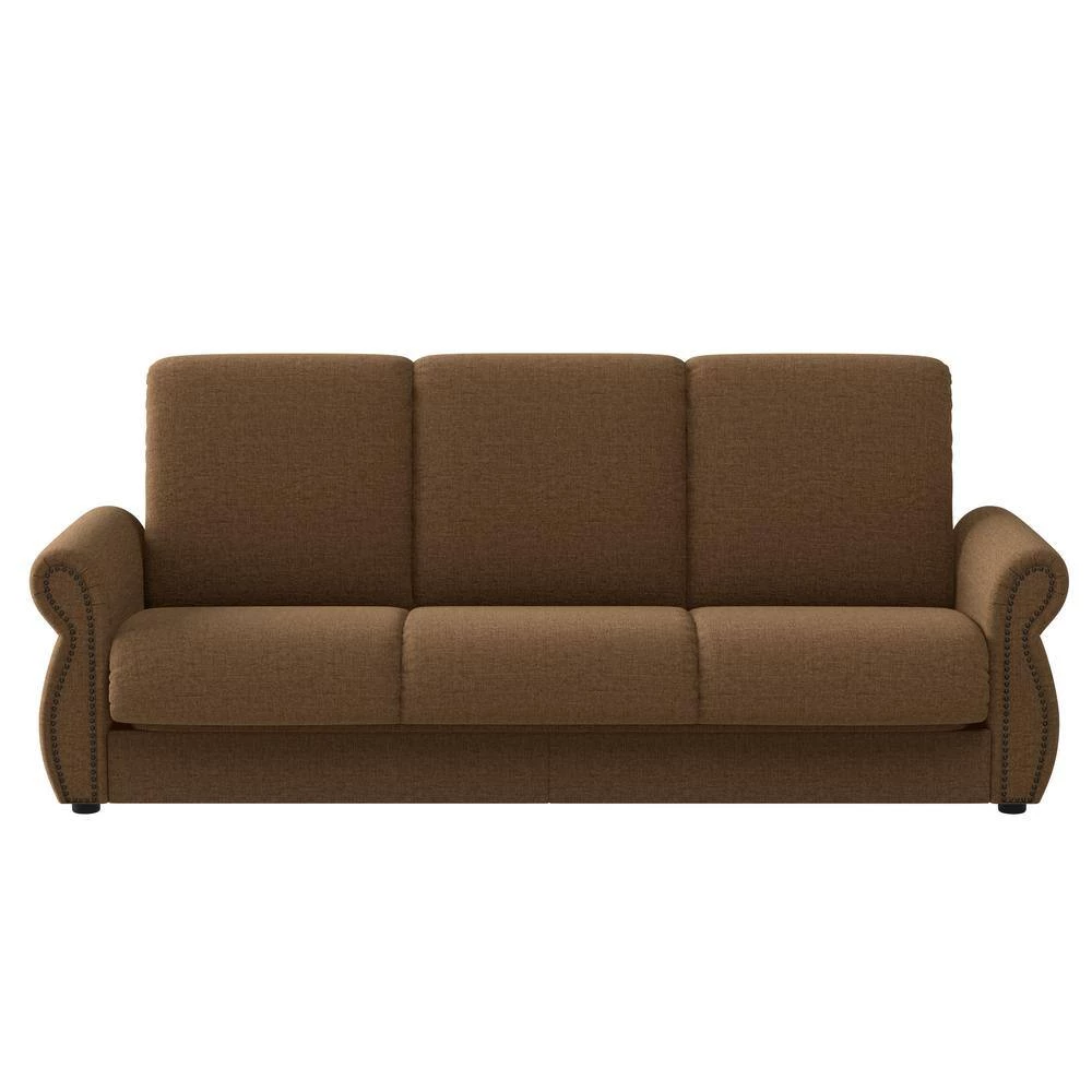Make room for an unexpected guest or create a modern bedroom with this transitional sleeper sofa with flared rolled arms. With a 3-over-3-seat and back cushion design, this convertible sleeper sofa is covered in a soft-to-the-touch chenille fabric made from 100% polyester and features bronze nail head trim. Easily assembled with included instructions. Imported, color may vary.