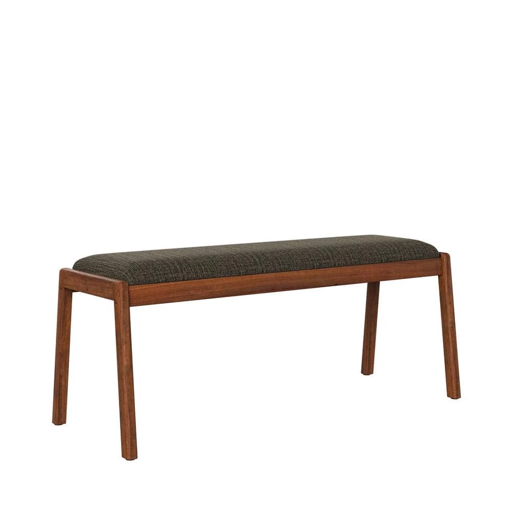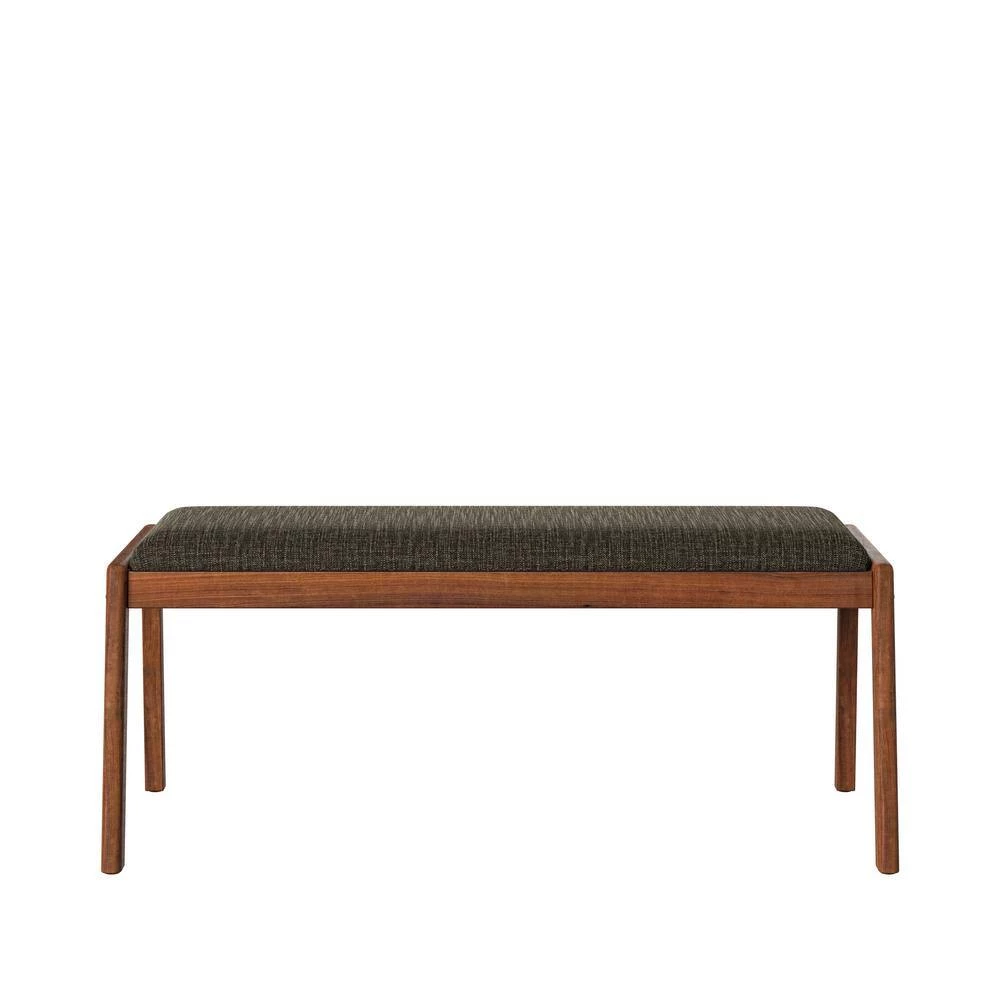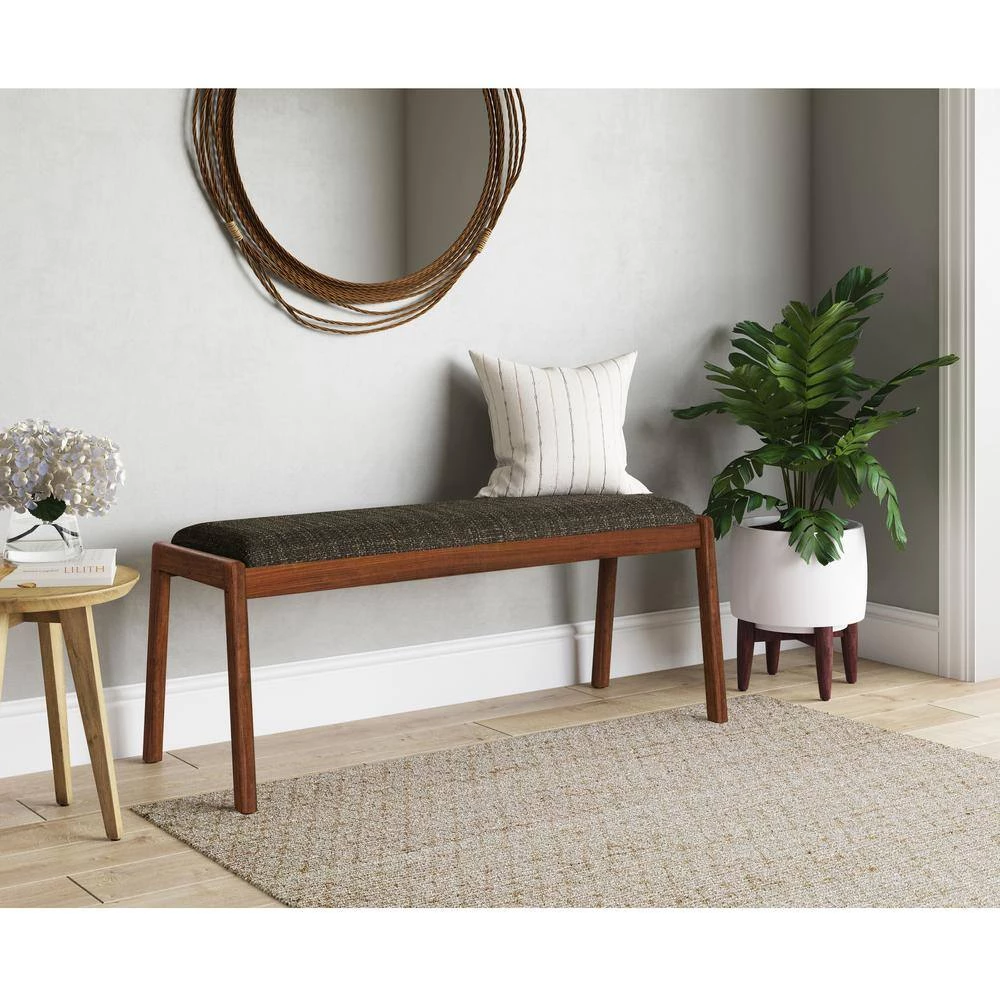 This armless bench boasts a mid-century modern design that will compliment your home. Features an upholstered seat top with a solid hardwood frame and legs. The rectangular shape makes it the perfect addition as seating for your dining table, but would also be an asset for a hallway, living room or at the end of a bed. Covered in a durable, easy clean 100% polyester fabric. Seats up to 600 lbs. evenly distributed. Takes less than 20-minutes to assemble with included tool and instructions. Ships in 1-box. Imported, color may vary.