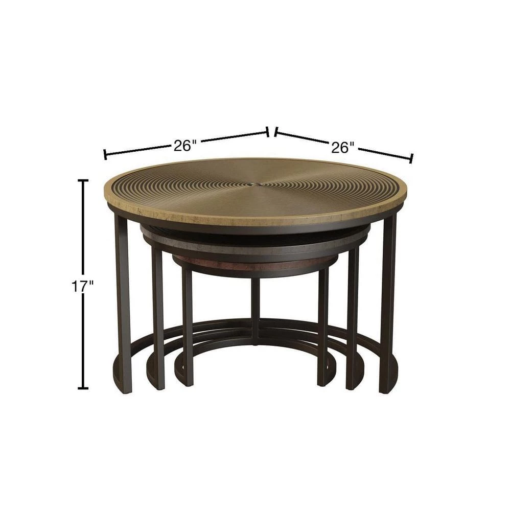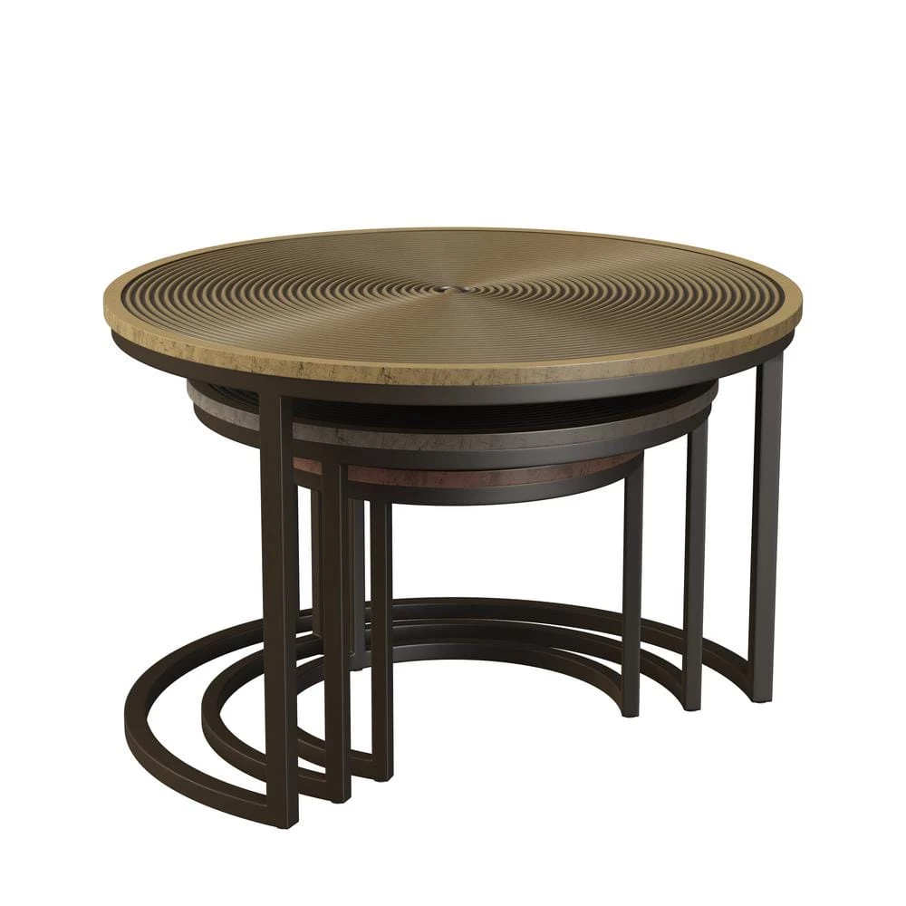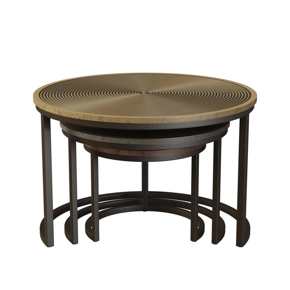 Hand crafted of metal and hand finished in copper, brass and nickel, this set of three nesting cocktail tables features concentric grooves that convey a sense of motion. The crescent-shaped bases with an oiled-bronze finish allow tables to nest neatly when not in use. Fully assembled. Imported, color may vary.