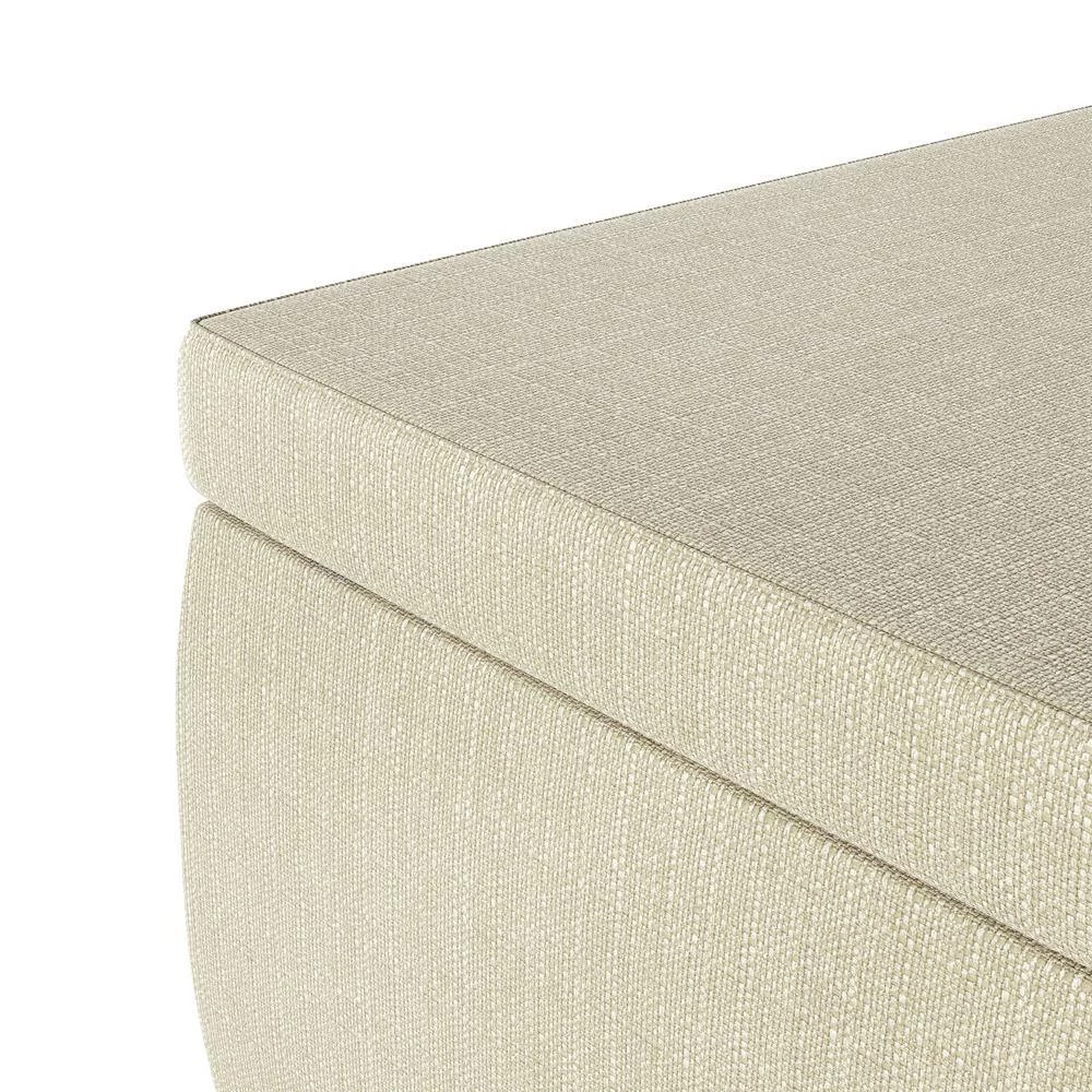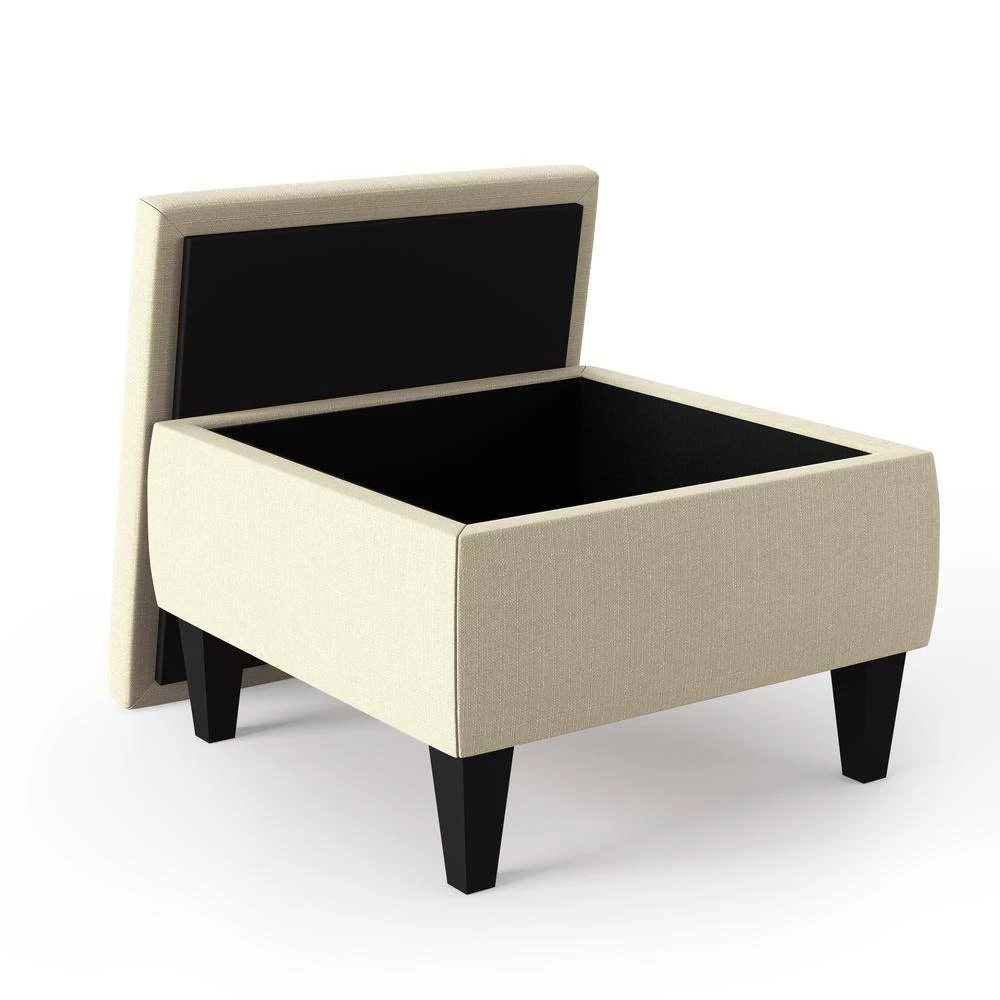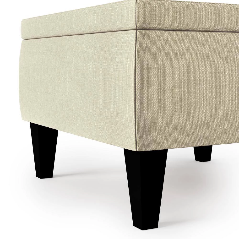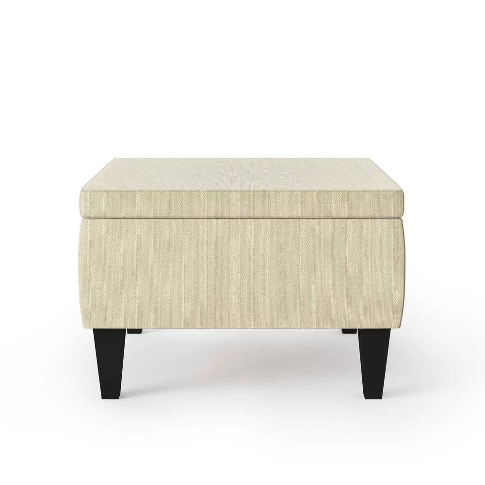 This transitionally styled square storage ottoman is designed for versatility. The ottoman boasts a top cushion that can be flipped over to convert into a finished table top. Covered in a durable, easy clean 100% polyester linen-like fabric. Ships in 1-box. Easy assembly, simply attach the legs. Imported, color may vary.