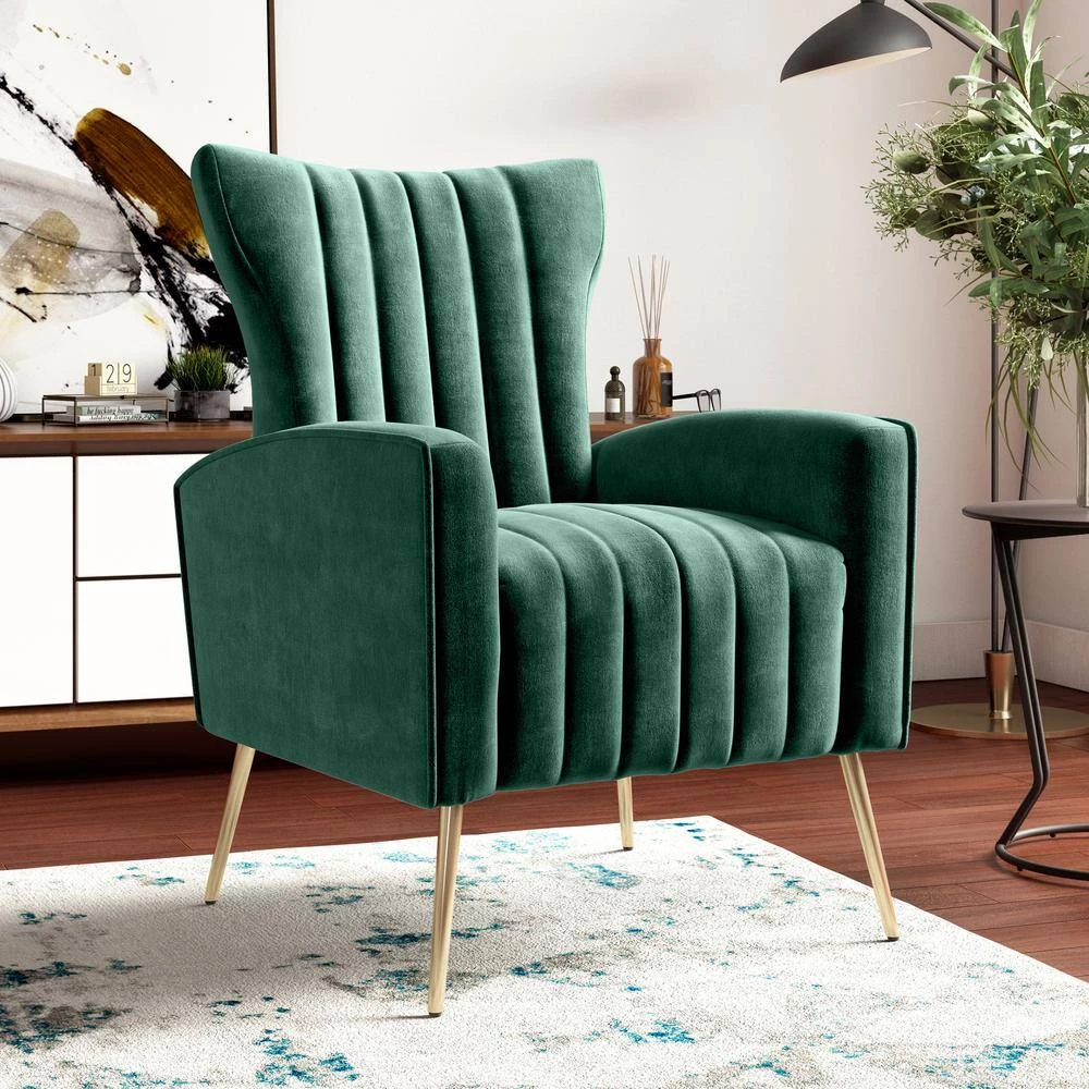 This channel-tufted armchair has a shapely silhouette that gives it a retro-inspired look. Upholstered in soft-to-the touch, 100% polyester velvet, the squared back has gently tapered sides, while square welted arms lend a tailored finish. Easily assembled in less than 20-minutes with included tool and instructions. Imported, color may vary.