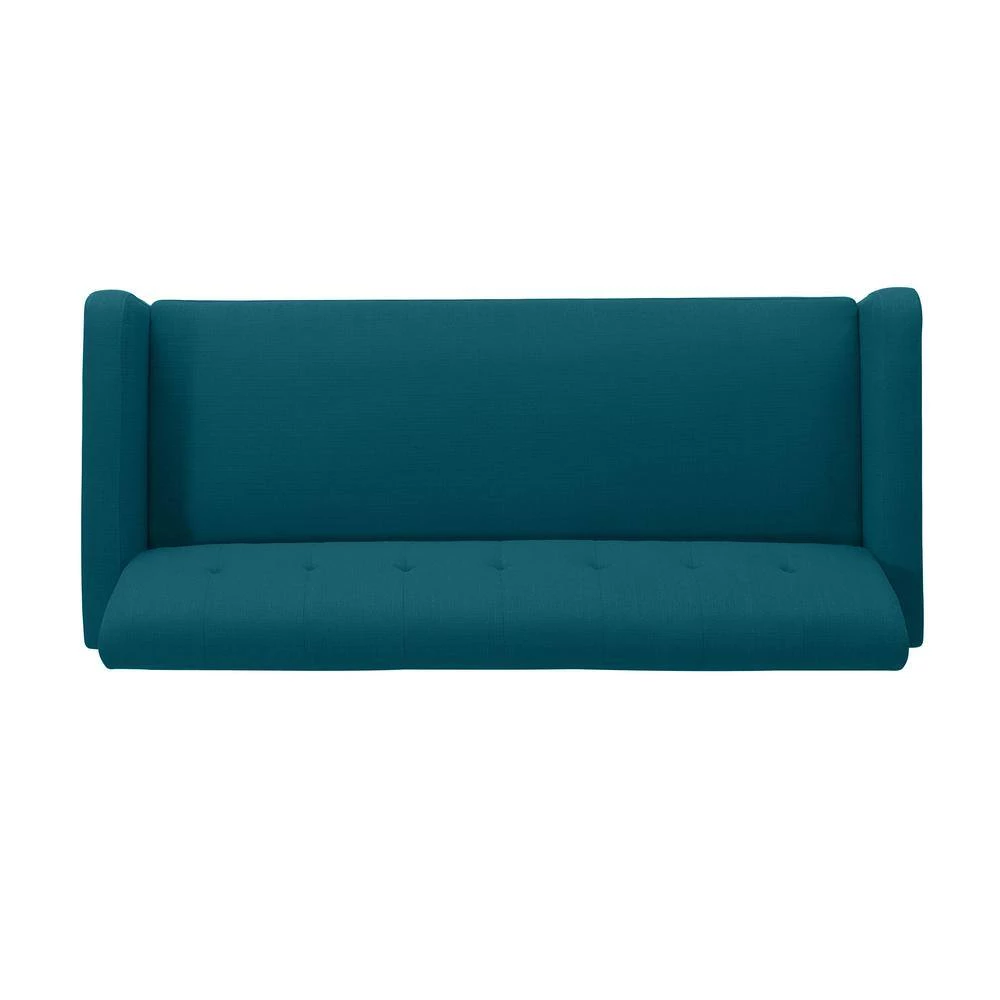 Sofa boasts a mid century modern design that will elevate your home. The sofa features a square back with lace tufted design, sinuous springs and a thick foam cushion for extraordinary comfort. Covered in a durable, easy clean 100% polyester linen-like fabric. HANDY LOCK easy connect, simply slide and click together in less than 15 minutes with included instructions. Ships in 1-box. Imported, color may vary.
