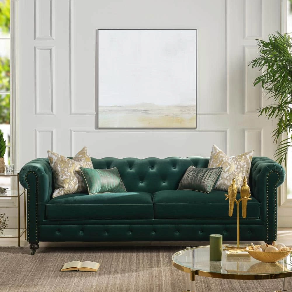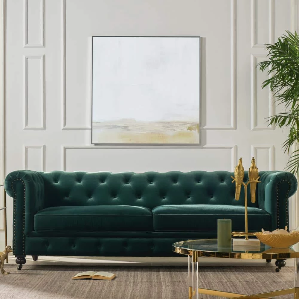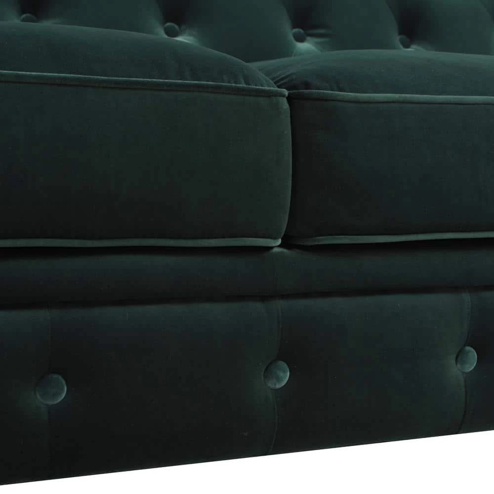 Stylishly impeccable, the Winston Chesterfield Sofa Collection by Jennifer Taylor Home provides the finest luxury seating for your home. Richly upholstered in velvet, this lush sofa evokes the classic Chesterfield design with hand-applied button tufting, smooth curled arms, a spacious seating for 3, dark espresso legs, and studded antique brass nailheads. The Winston possesses a sophisticated vintage chic that never goes out of style and is sure to remain a centerpiece in your living room, guestroom, or parlor for years to come. Two convenient casters are included on the front legs for ease of relocation. To bring the whole room together, the Winston is also available a single armchair variation.
